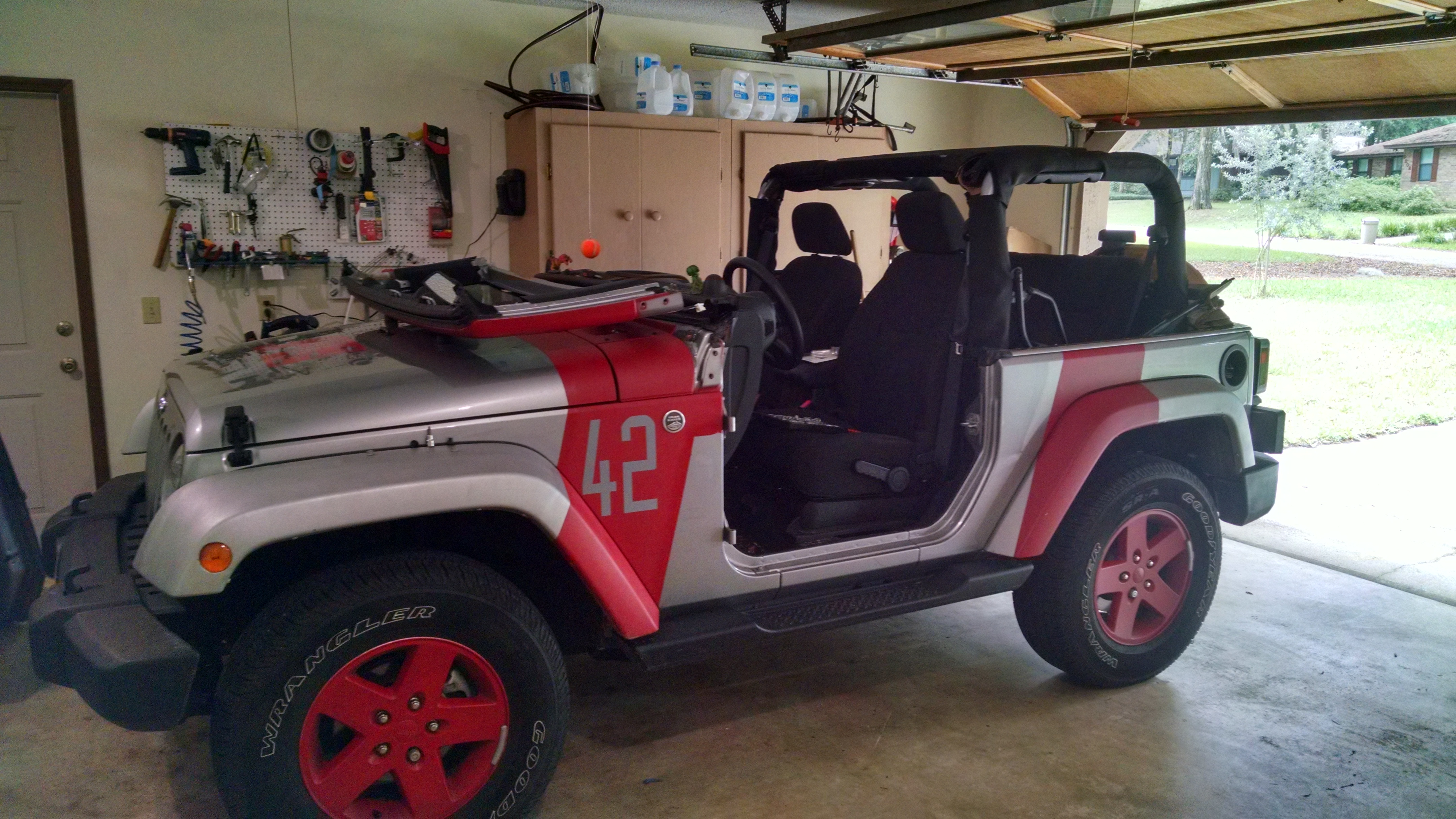 Thanks everyone! I've seen a few other people on this forum also detail their JK's as well. I believe I'm the first to find a supplier for the spice soft top for this model?? That took quite a bit of hunting on the internet. The door logo is the standard size (four piece) that came with the JP decal car kit I purchased off Ebay: complete with the hood, and numbers decals, and license plate. Yea, the full JK door makes the decal look smaller. But, I can deal with that. My biggest concern is how the Plasti-dip will hold up to the Florida sun and the love bug season. Plasti-dip's website has some other products claimed to act like protective polish for their paint. Maybe I'll look into that? But hey, As I said earlier, this project is meant to be temporary. So far, the dip is holding up really well. Oh and just to let you all know, that is a 2013 Wrangler SPORT. Those are black fender flairs sprayed with silver Plasti-dip. I did the fenders long before ever attempting the JP conversion and those fenders have taken quite a beating (daily commuting and parking in the sun, as well as lots of heavy rain) with, so far, no signs of wear on the paint!:)