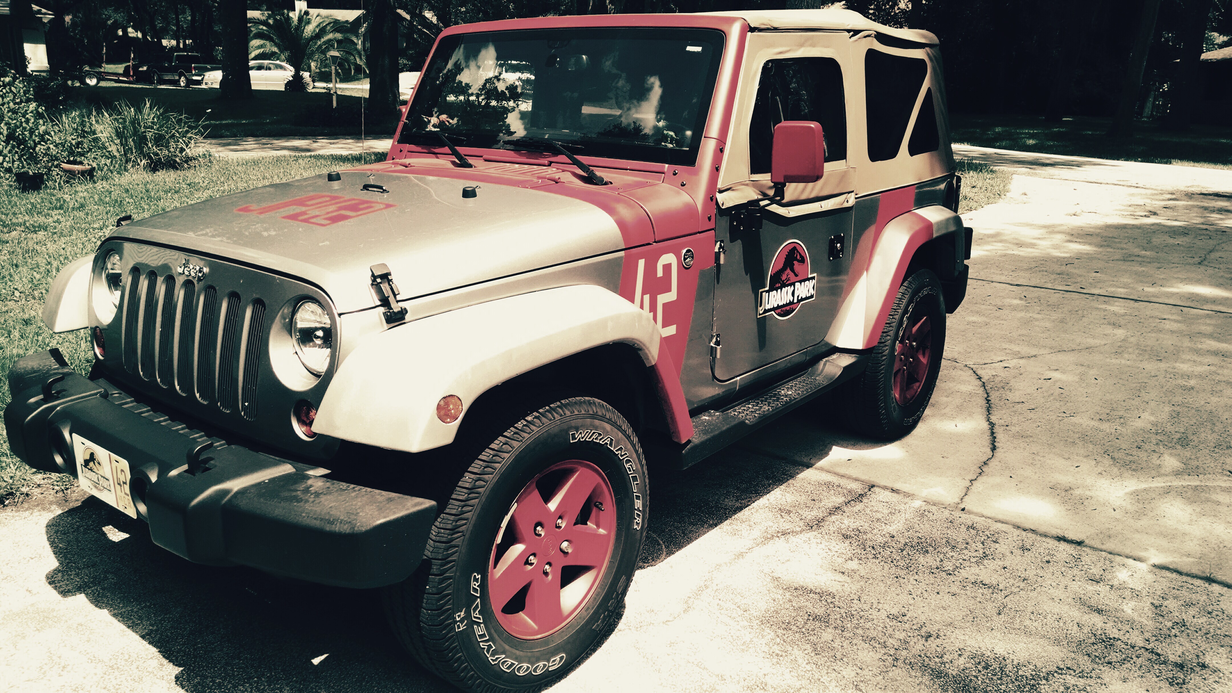 I wanted to post an update on using plasti-dip for the red stripes. It has been nearly a year and that stuff is holding up great. There are small nicks and pits in the paint from the daily use on the roads. That is pretty much unavoidable. Even so, it is nothing a little touch up paint can't fix. And another important note. If you allow dead bugs or bird crap to dry on the plasti-dip, when you finally clean it off, that stuff will peel the paint. In other news, here are more pictures of my JK with half doors and the soft top on. Also, playing with the photo setting I made a picture fit in with Jurassic World just to see what it could look like. Shame that the movie didn't use the new Jeeps.