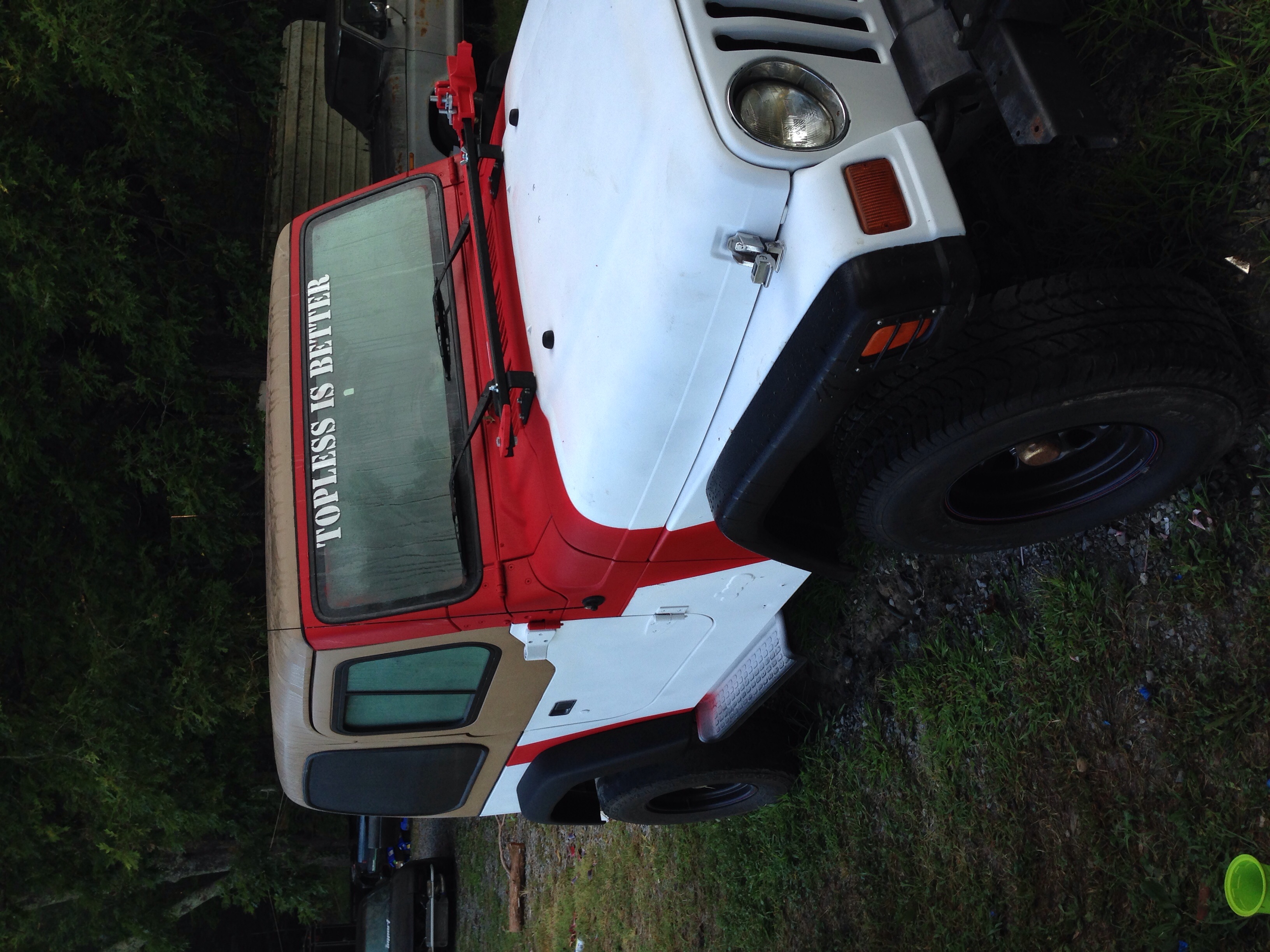 Been working on my tj, just finished paint. I wasn't going to share pictures until it was finished but I'm pretty excited about it so I figured I would share anyways. I took a little different path with mine and kinda did my own thing, I did white and red. I had over sized fender flares but traded with a buddy for his stock, re painted them black and I like the way it looks may end up painting them to match or going with tube fenders haven't decided just yet. I still need to paint my wheels red and get my decals put on, hopefully have my decals next week and I'll post more pictures. Thanks for looking (and yes I'm taking the step rails off haha)