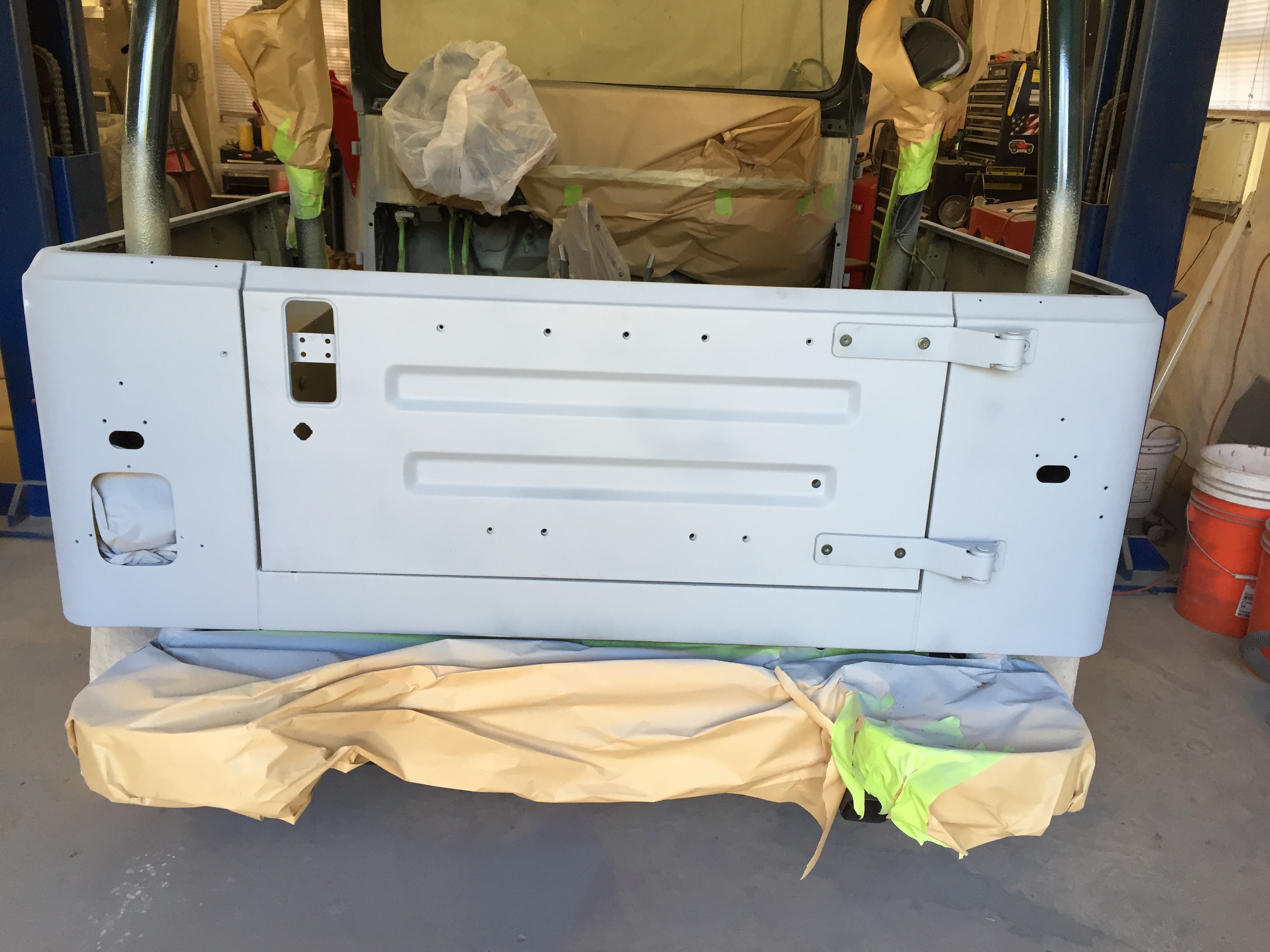 The body overall was in good shape but the paint was worn and peeling, Jeep was sanded all dents removed and primed for block sanding including doors