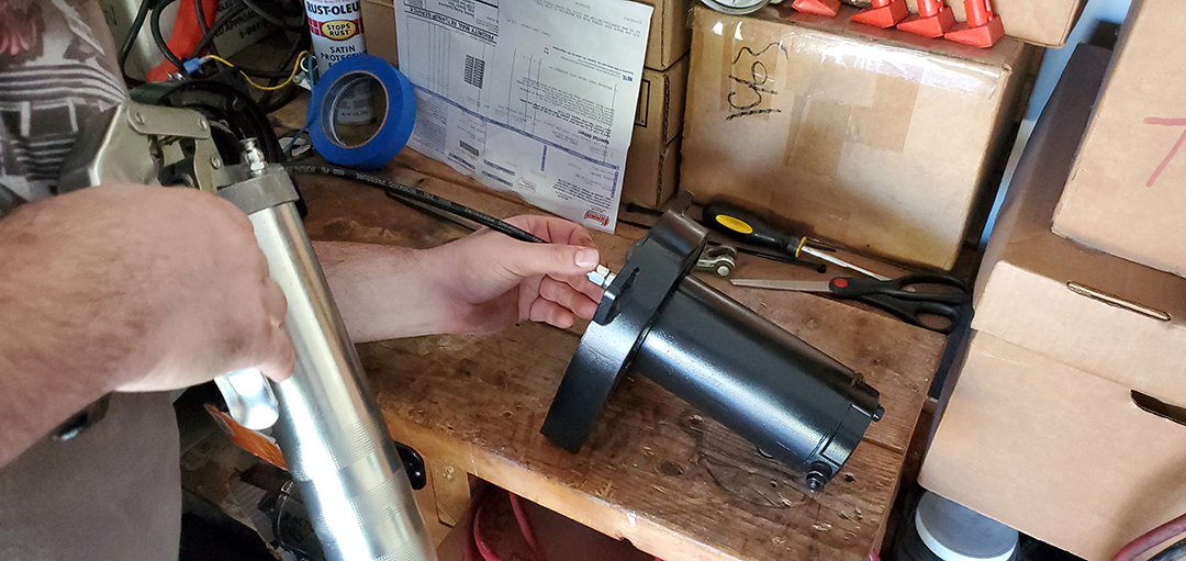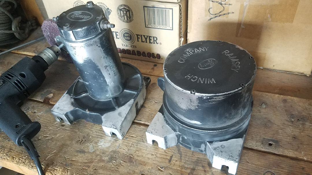 Dwight supplied me with the winch but it was in need of a little TLC. Time for some cleaning, sanding, greasing, cleaning, spooling, and painting.