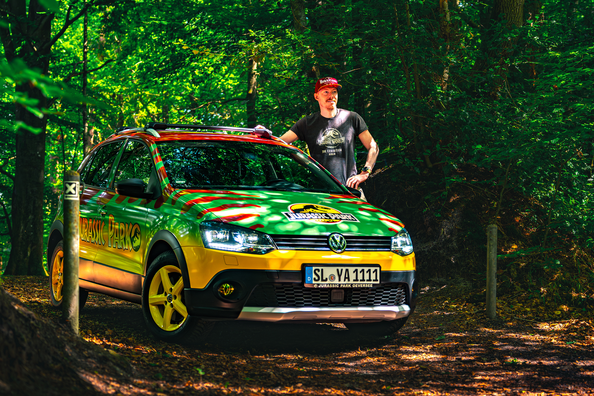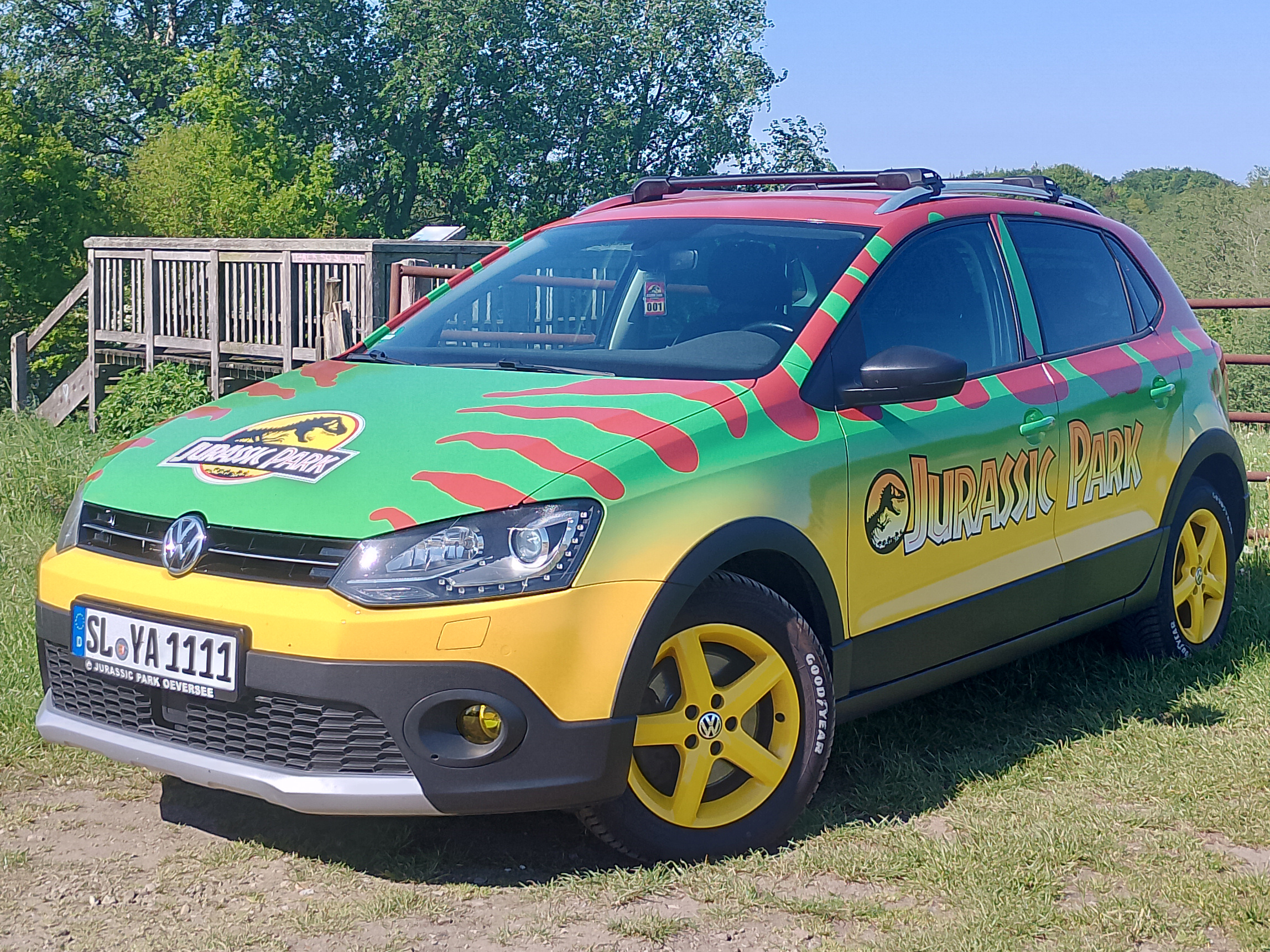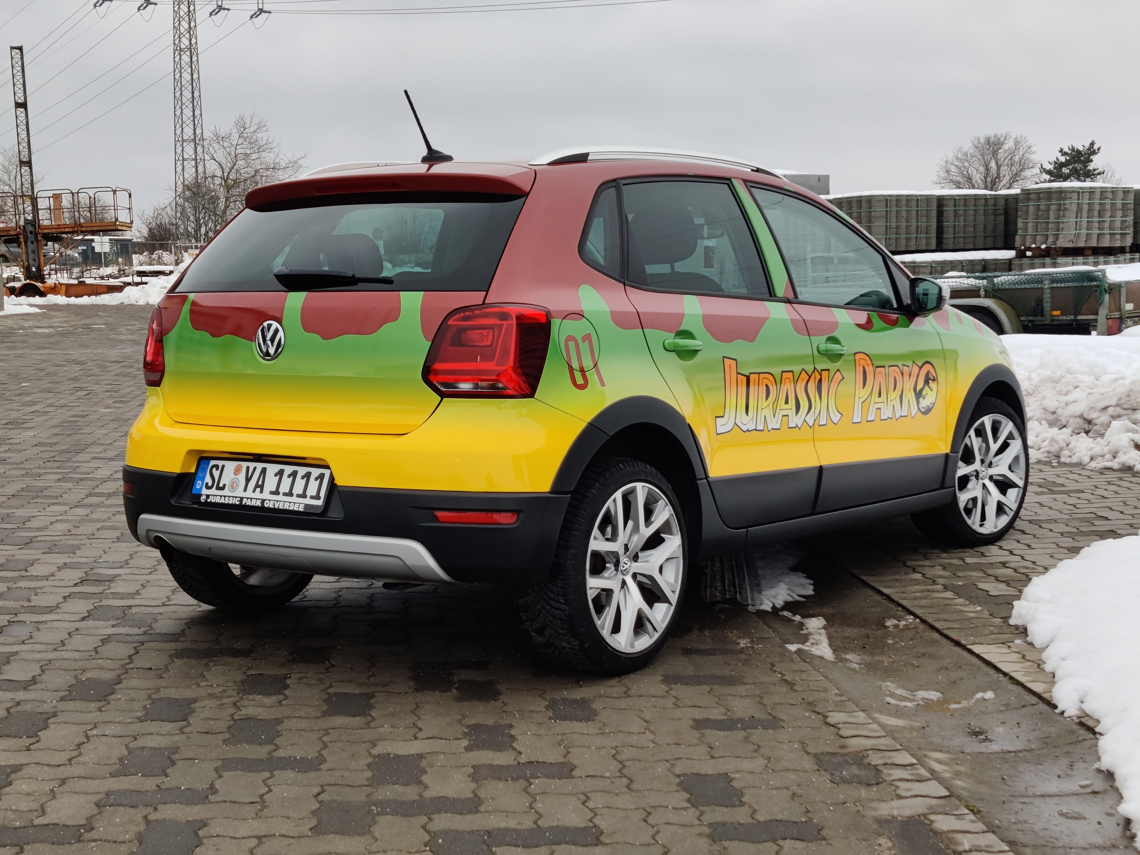 Hi my name is Yari and I am currently designing JP01. In Germany, our Jurassic Park is a bit smaller, so we drive the 2016 Volkswagen Polo here. Gasoline is not cheap either, so I chose the 1.0 TSI (110HP). The mirror tag is up and the wrapping is finished. The 17-inch rims will soon be replaced with 15-inch rims, which still have to go to the painter. The mirror caps will also be black and possibly the B-pillar too.