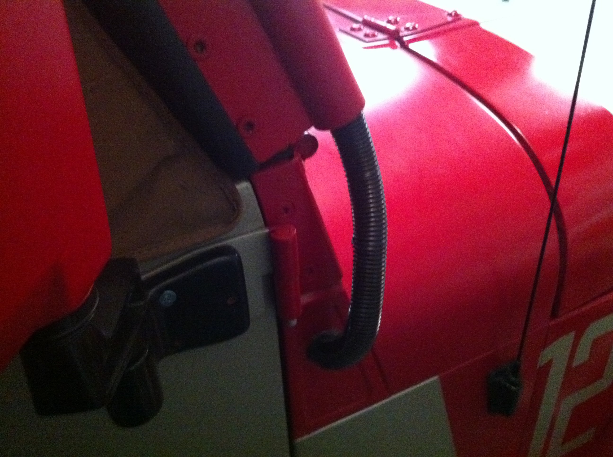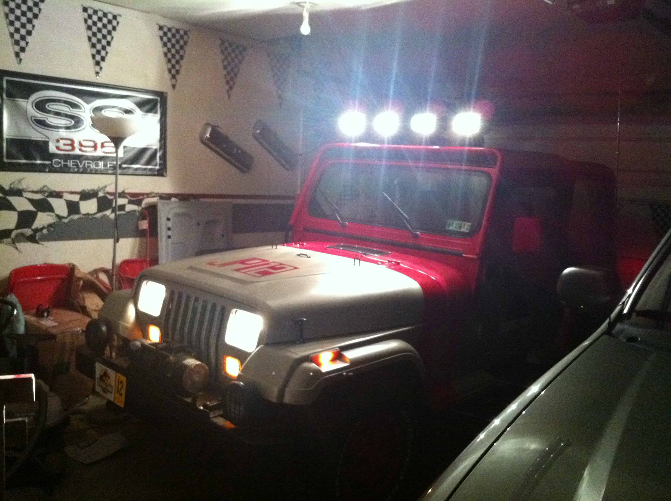then i drilled a 1" hole into of the side of the jeep that goes into the passenger compartment. Then i ran all 4 wire through a grommet and into the interior compartment. Here you can see that i mounted the switches to the oh shit bar above the glove box