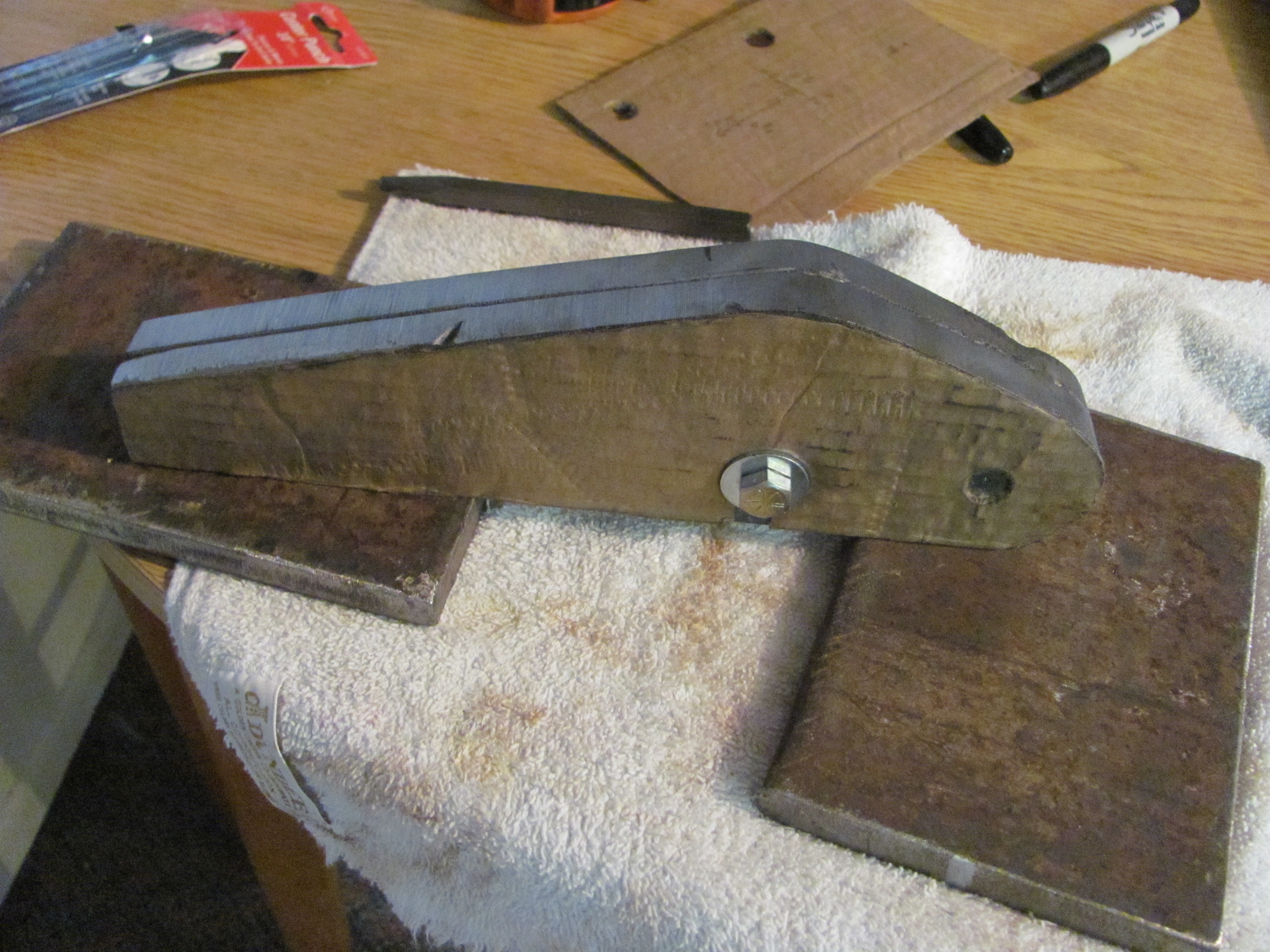 The two pieces were sand blasted, taped together and then a hole drilled at the top of the plate notch. I tightened the bolt up so that the whole thing would not move and then it was ground down with a table grinder and then belt sanded. I just center punched the hole up front and plan on using a hack saw for the notch after i get the hole drilled.