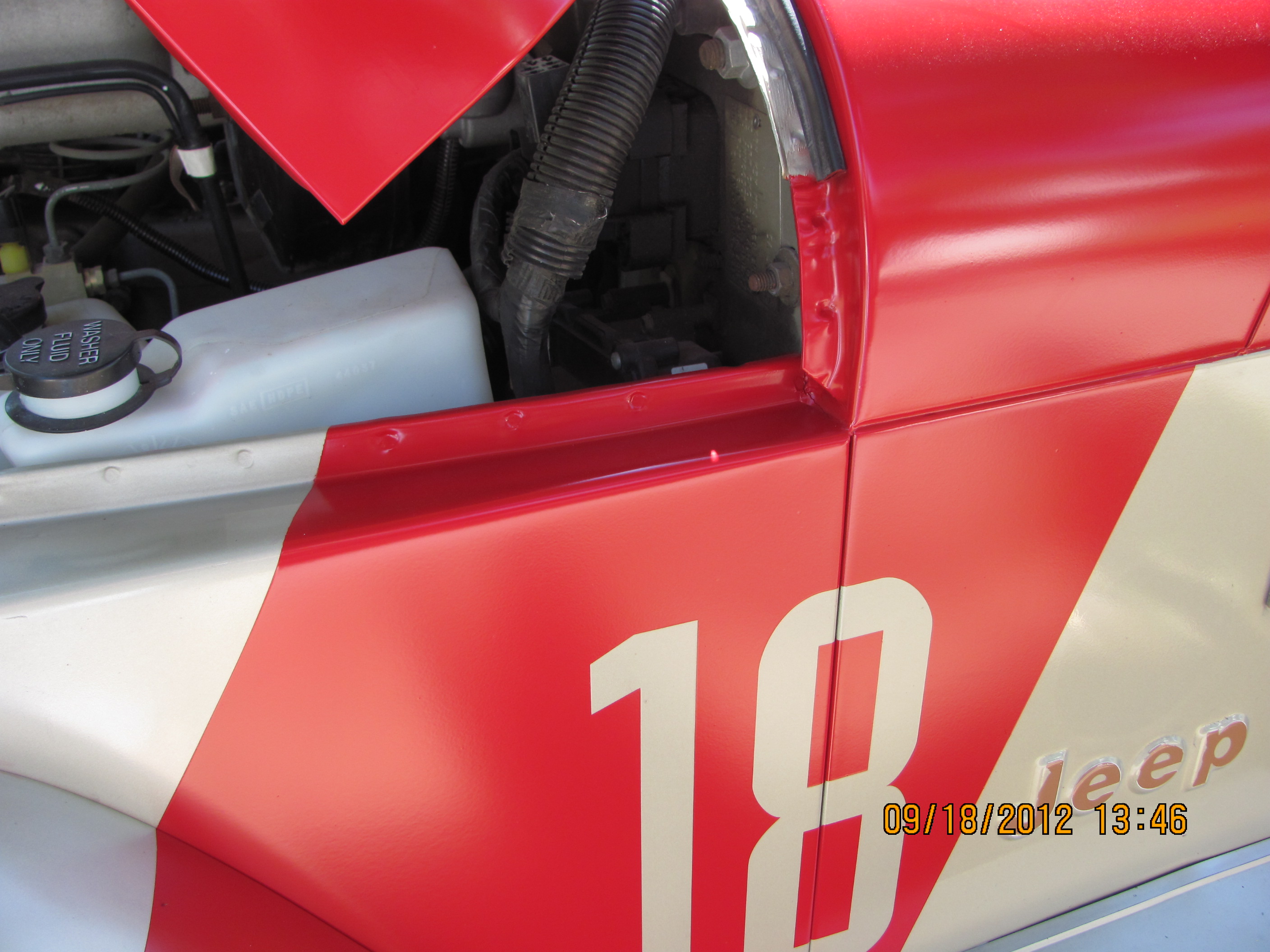 8) Now the real challenge, striping out the Jeep. Using the still photo's, I found some reference point's. I didn't have a picture of the Hood but I found a starting point of 5.5 inch's on the forum for the hood stripe. This was a reference point from the hood's edge to just past the hood hinge's. Now I could bring the striping tape down to the flare to the second reference point. I found this by using the front of the fender and running a straight edge to the rear of the flare. To keep the curve consistent, I used 8.5 inch's at the lower hood to fender gap. The rear of the stripe by the door was found by finding the center of the second "e" in Jeep and running a a straight edge up to the body line. This gave me a starting point for the tape line that ran down to the flare seam. Fine line tape was used to tape off the stripe. The 18 is in the wrong position at this time.
