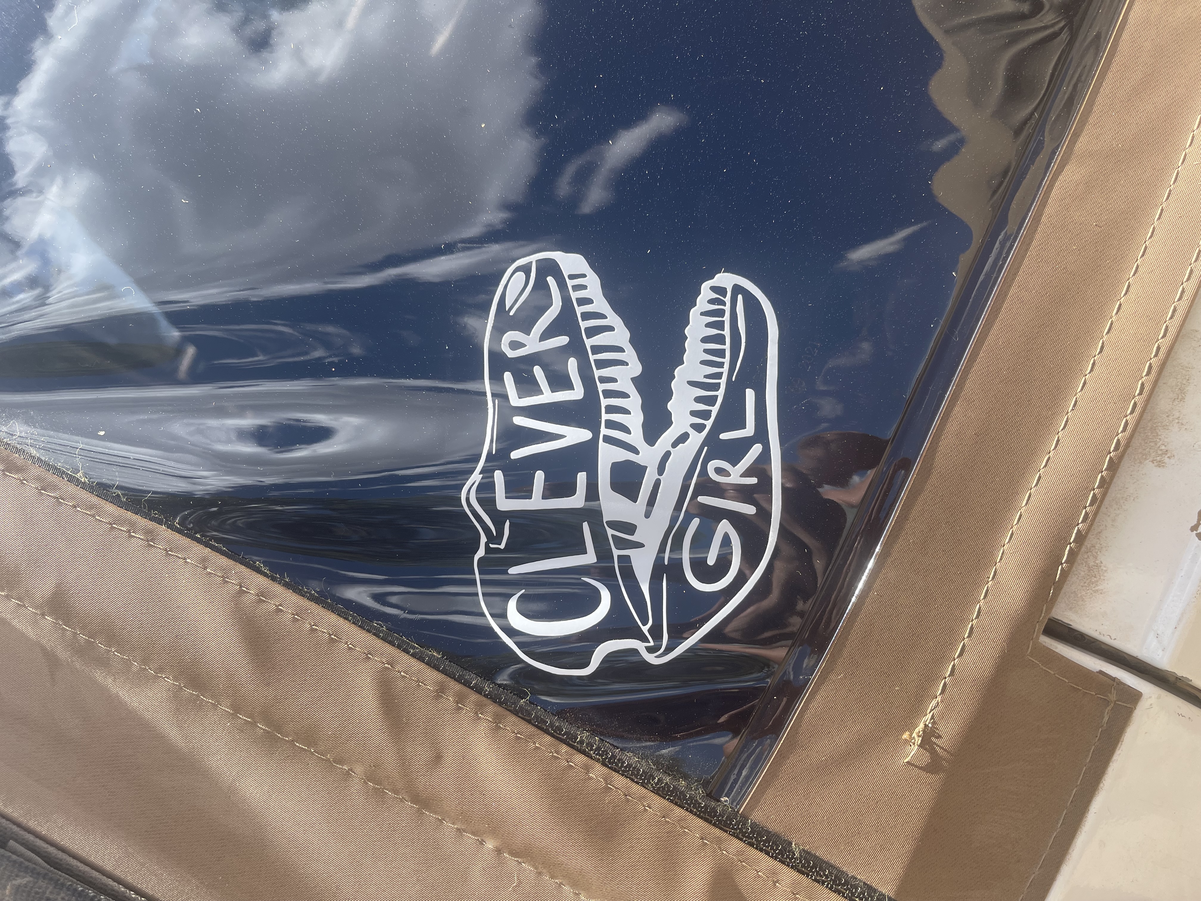 So, I gave myself a nice birthday present. My jeep came with an OEM hardtop, which I sold for $1200 (wasn’t in great condition but it was nice) I also took the $180 a piece off road wheels off and traded for some things with the guy I sold the top to. Turns out he has a business parting out old jeeps. Ended up rolling away with screen accurate wheels, door surrounds and a tailgate bar. When I got home, I got online and ordered my Frameless Spice Soft top, All Decals, License plate, mirror tag and a fun rocker look clever girl t shirt I found on Etsy. I also had enough to get my monstaliner! Liner is on deck to order as soon as my side decals get here so I can color match the tan vinyl as closely as possible to one of their tans. Just need to get my paint for the wheels and some paint to refinish the bumpers and handles as well. Plan to put CleverGirl in a car show on august 26th so no time to waste. Getting my stripes!