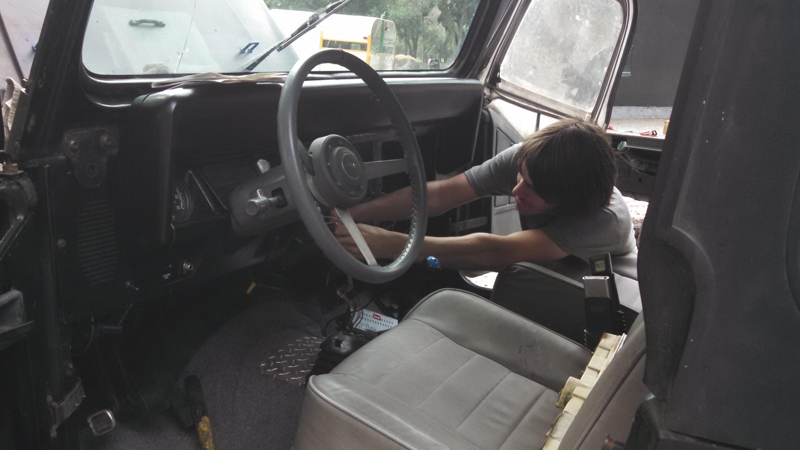 Today, if the rain holds out we are going to tackle the blower motor and the dash lights. We were given a new (used) front bumper the other day. It was on crags list for free. I had to drive 3 hrs for it, so it wasn’t that free. We know that it is not the one in the movie. However, we were thinking of using it for now. It is tied up on the front to see haw it looks. Since the jeep is jacked up and has bigger tires on it. We were going to build it as a JP on steroids. It won’t affect the paint or anything. What do you think? Well let me get back at it. WOW this is a lot of work, but fun. Finley something my son wants to do other than computers. Lol.