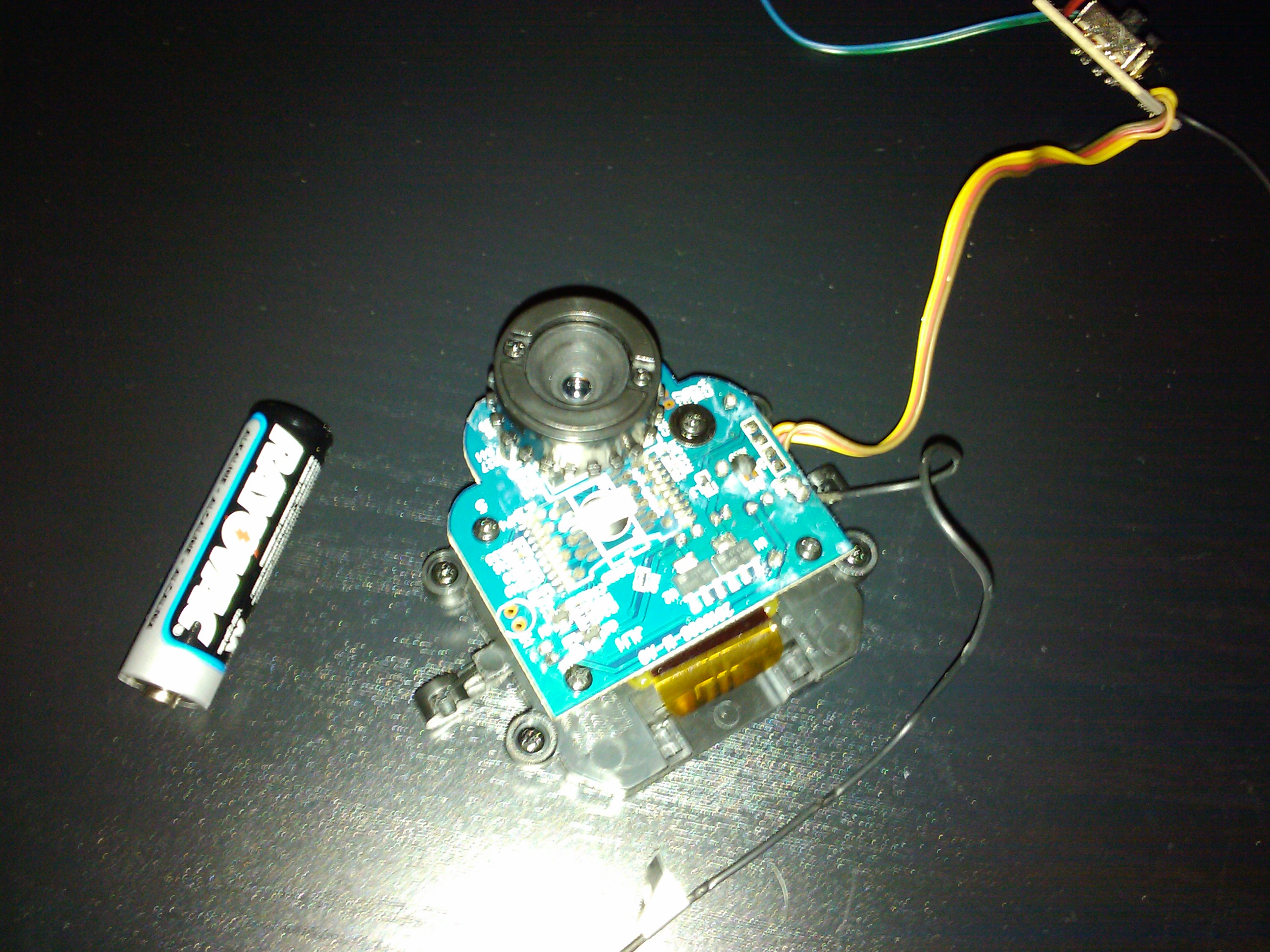 and here's the guts of it. There's a small ccd chip underneath that lens. It'll take quite a bit of work, but I think it will be possible to build the lenses to focus light onto that ccd. If not, I could always make the lenses just have dummy lenses in them and hide this thing inside. There's a small, probably 1.5" lcd on the back side that displays the image in B&W, green, red or blue tinted. It does surprisingly well in the dark, with the IR illuminators.