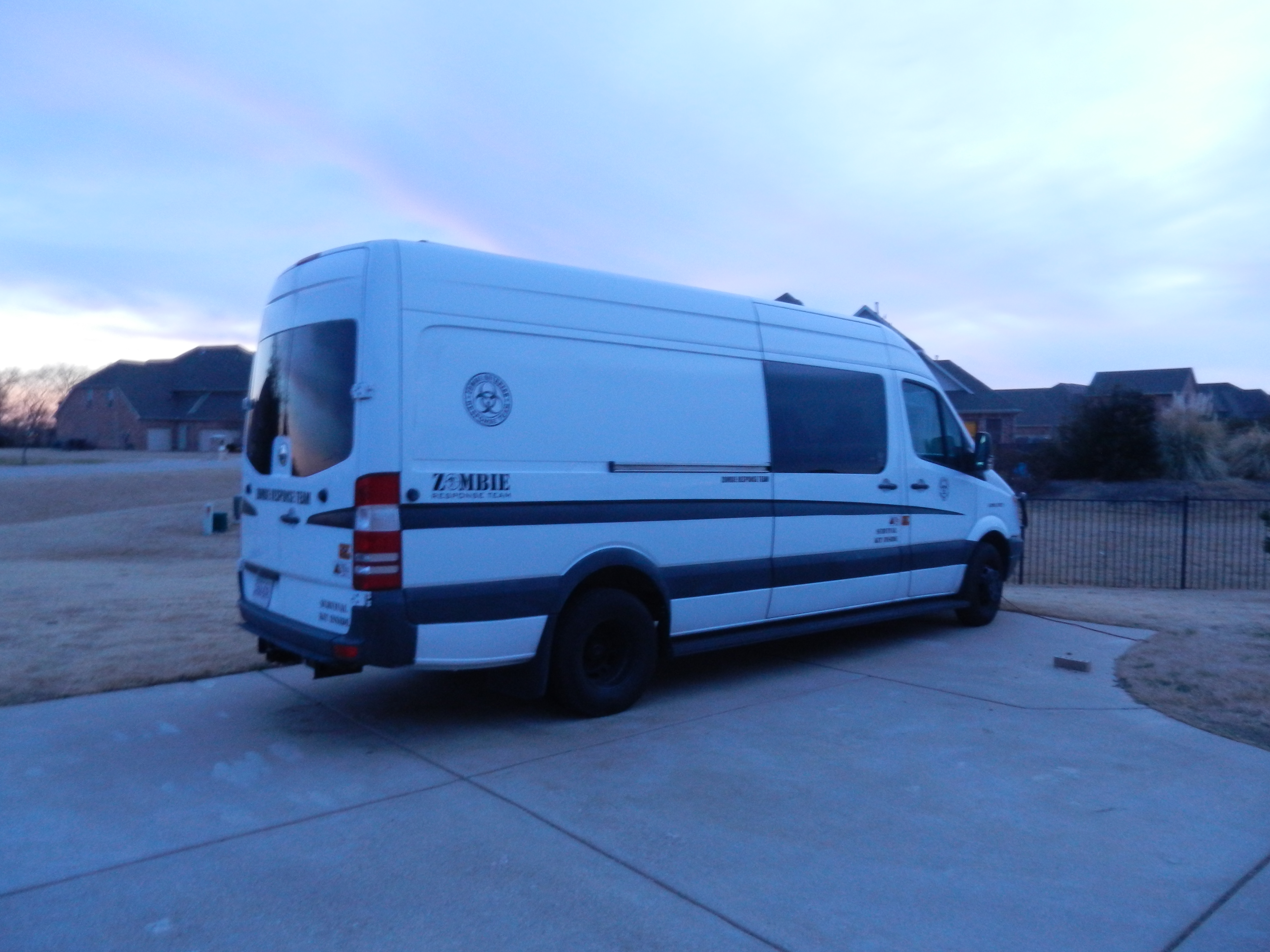 Well we wanted to build an RV and thought that a zombie theme would be pretty fun. Its an work in progress we still got to finish up most of the interior and for the exterior were going to put a roof rack with a machine gun on top and some more sirens and a few other things. But when we bought it it was just a cargo van with some shelves inside and we put the windows in the sides and back, painted the wheels,put the grill guard on and a bunch of other stuff and for the inside we put some couches and chairs in the inside and a tv and stuff. We have some others toys but nothing with a cool theme like the RV or the jeeps.bryceaugustine wrote:u also have a zombie response van...anything cool done with that? do you have it for the fun of it, or does it serve a function? while we are at it, any other cool themed vehicles we should know about?