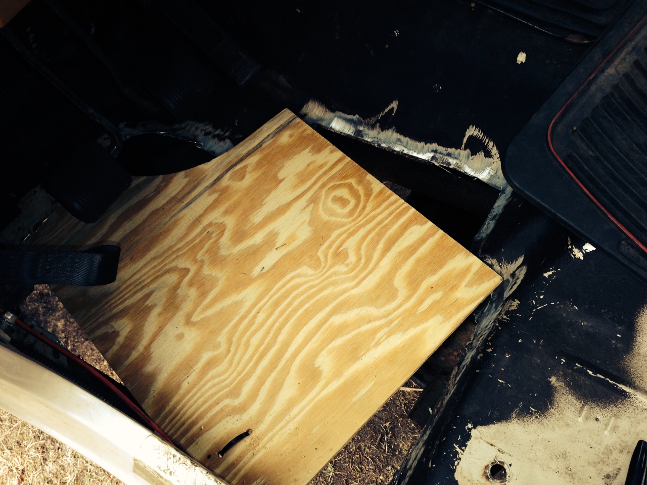 Floorboard was repaired this past weekend. I didn't grab any "after pics" but here's the "before" pic with a piece of wood placed over it to keep myself from being sucked under the vehicle while I drove it to my buddy's.