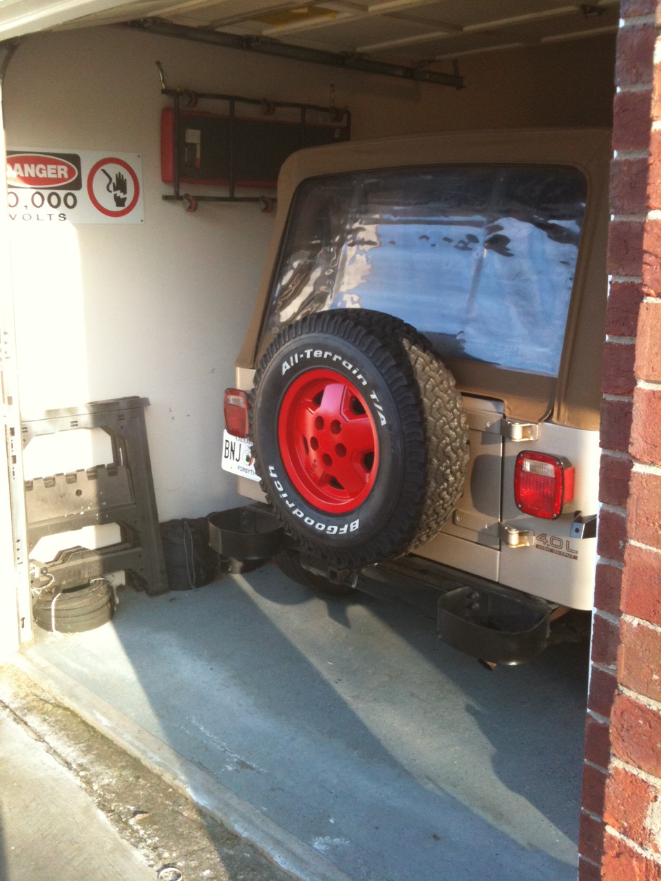 Well, at least it looks more like a JP Jeep from the rear now. Mounted the tire I found on craigslist and DA sanded and painted/clearcoated the wheel. Turned out pretty nice.