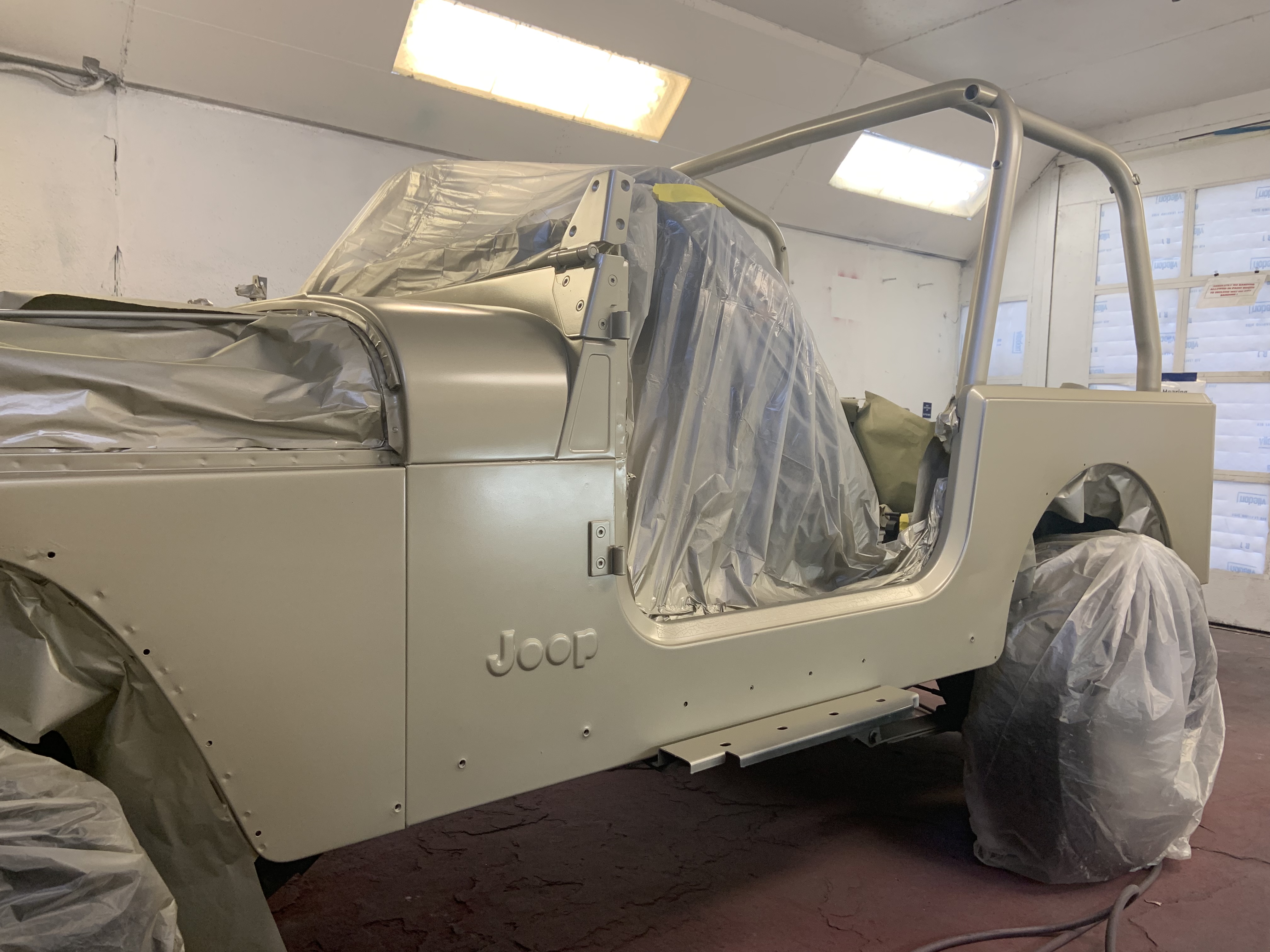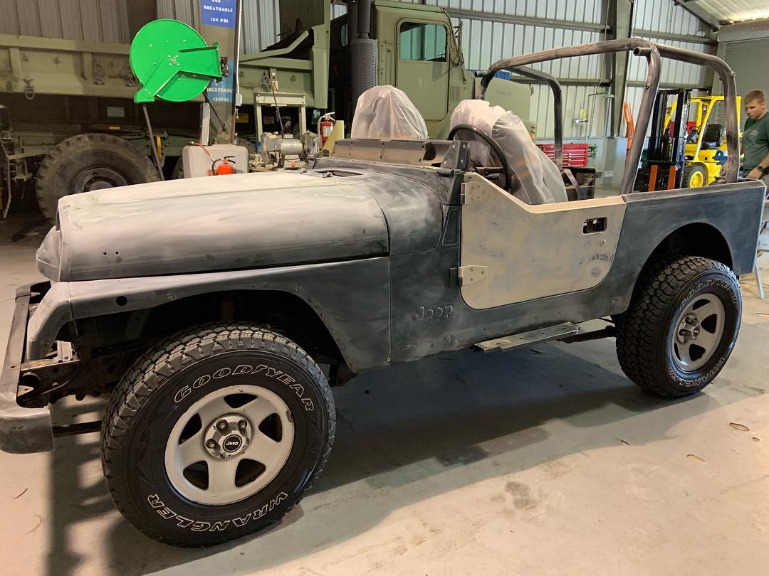 I know I haven't posted recently, but don't think i've stopped working on the build. Since my last post of getting my light bar test mounted, i've made a lot of progress. Managed to strip trim pieces off, sand, prime, and paint the entire jeep sand beige. Got the rims sandblasted, and received my decals (401 Graphics) and plates (Celebrity Machines). By the way, i've decided to change my Jeep number to JP18. Mainly because I was going for 100% screen accuracy so I didn't want to have a non screen accurate number on a screen accurate jeep.