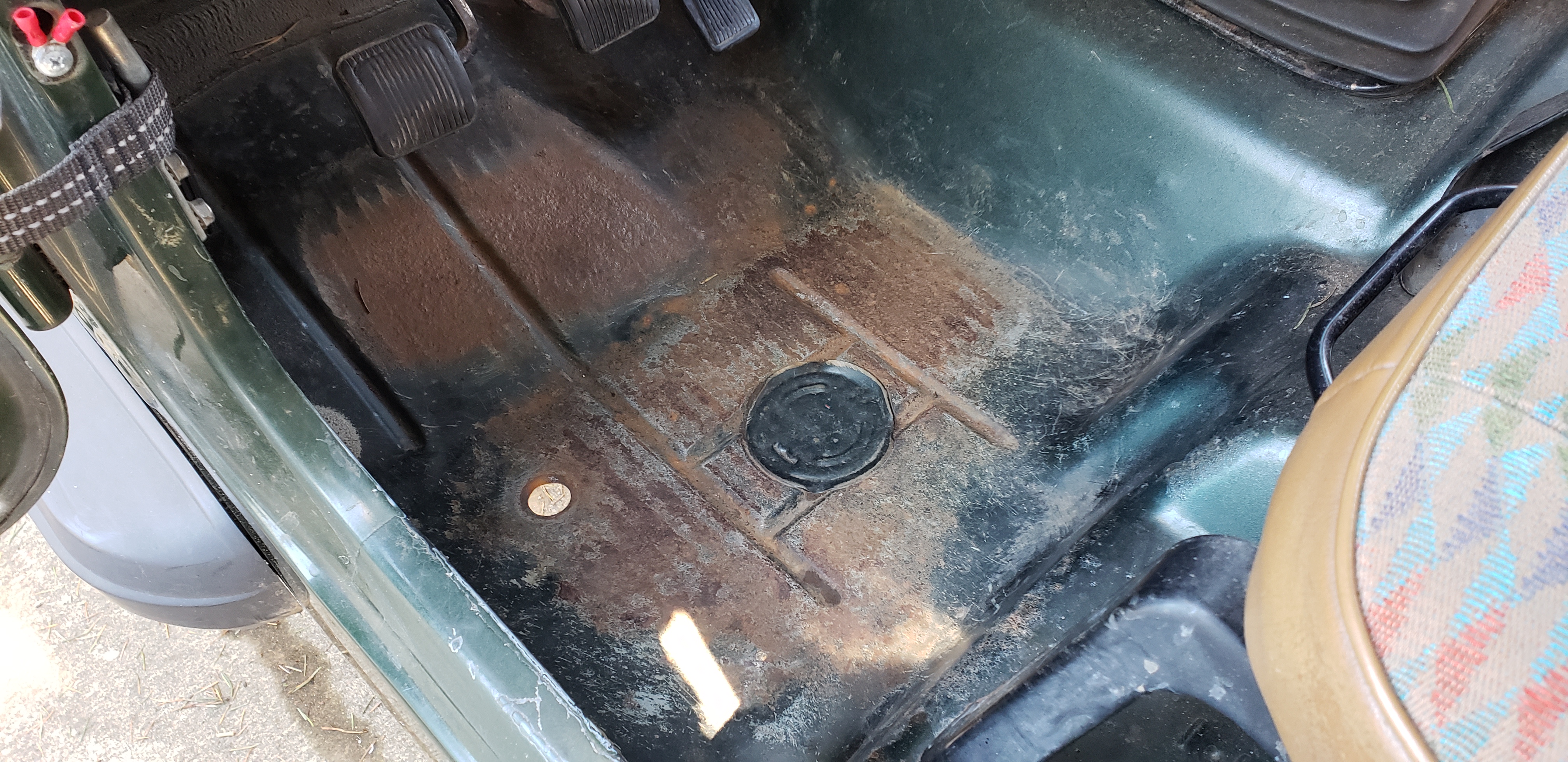 This is a before/after of the rust in the footwell (I was mistaken earlier when I stated there wasn't much visible rust there). All I've done is scuff it with a wire brush and lay on 3 coats of Loctite Rust Neutralizer. So far the rust has turned mostly black, which means the chemical reaction has turned it into a paintable surface. Once fully converted (or sanded away in some areas) I'll lay a coat of regular Rustoleum to protect it in before laying in the new carpet.