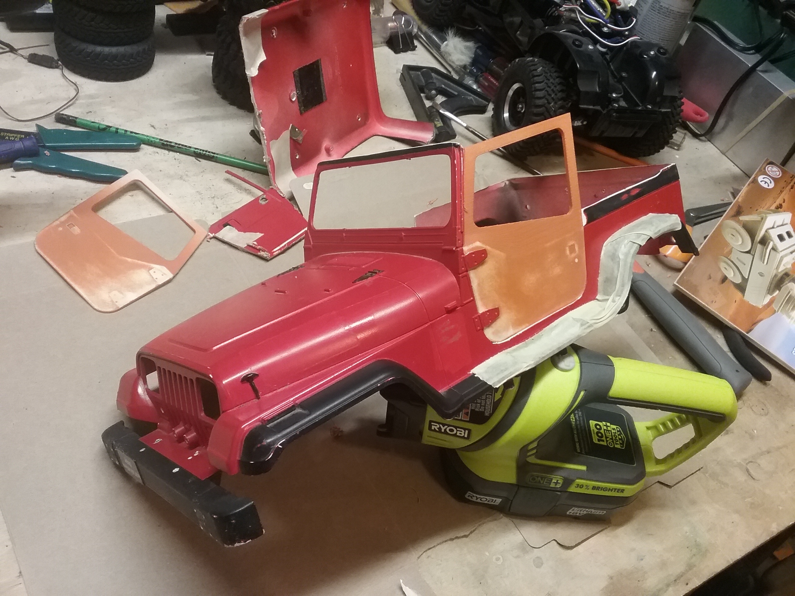 I've been busy with other things, but found some time to work the Jeep body. I'm attempting to get the new doors to fit.