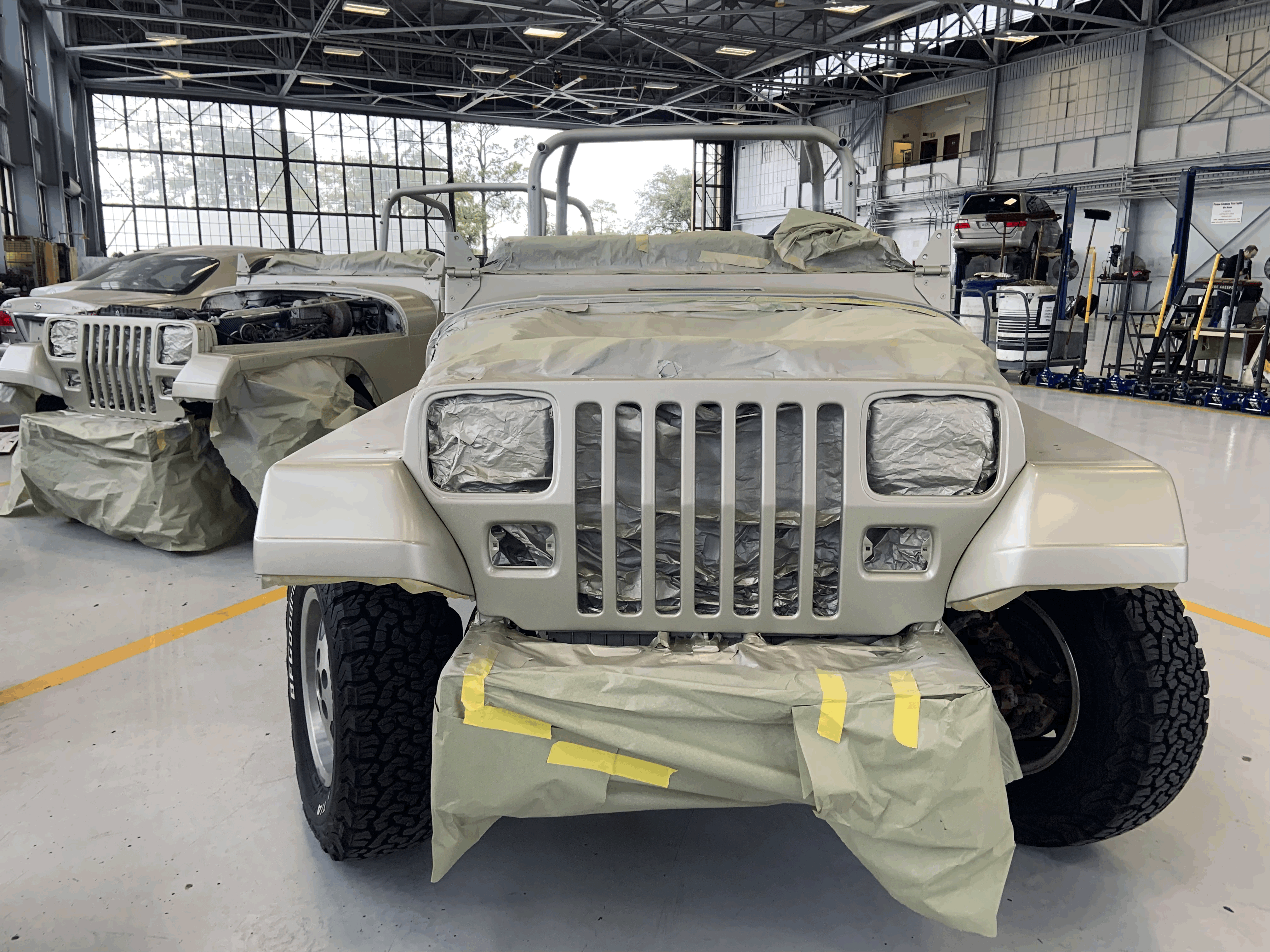 Tomorrow we will be doing the fender flares with Sherwin Williams P30A primer since it has an added flex agent, and then with sand beige. Cracking and chipping paint on the fender flares have been one of the biggest pains of these Jeeps since they flex so much, so we spent a little extra money to hopefully help alleviate that problem in the future.