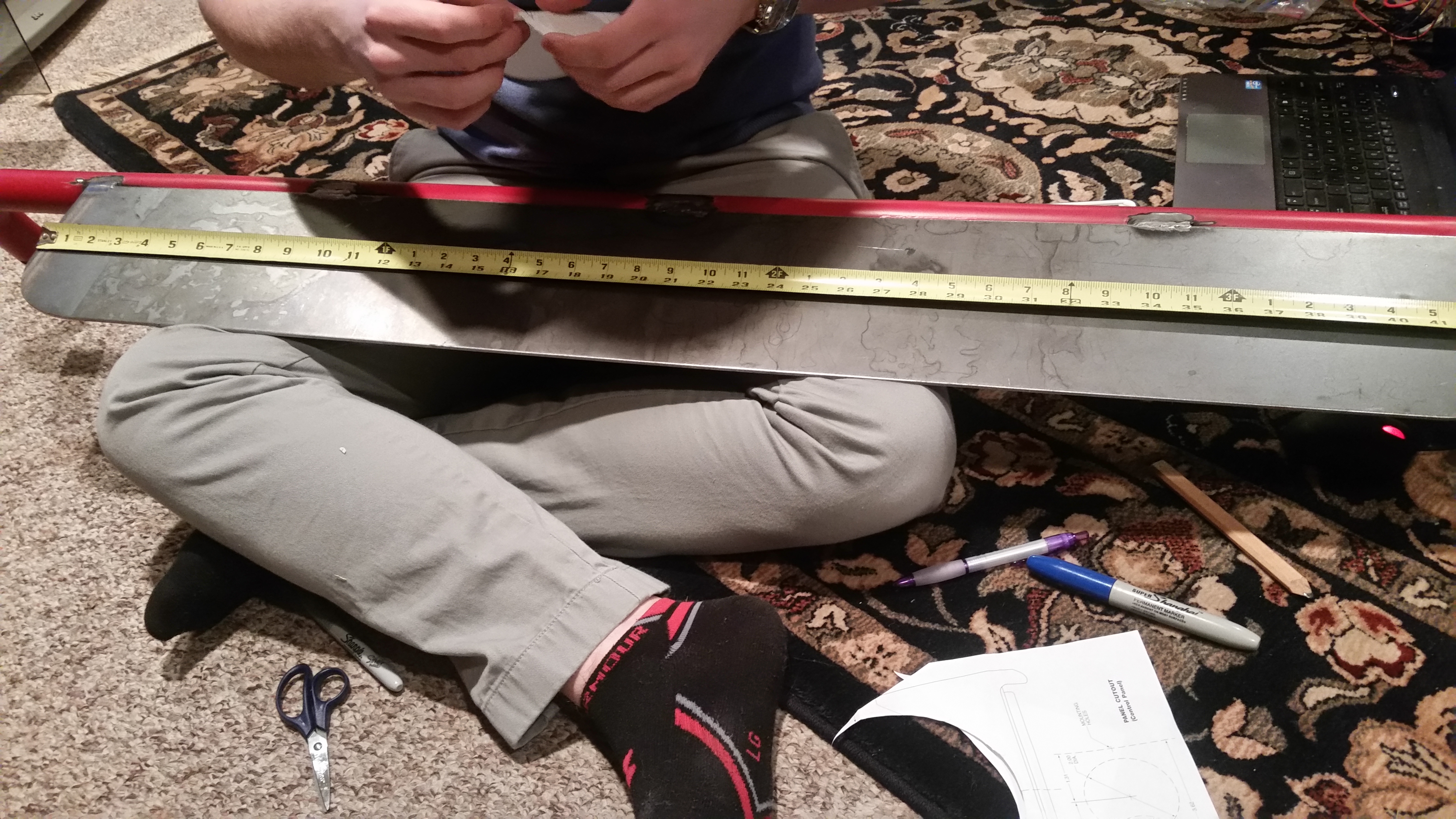 A picture of me and my buddy measuring up the holes to be drilled for the light wiring and mounting