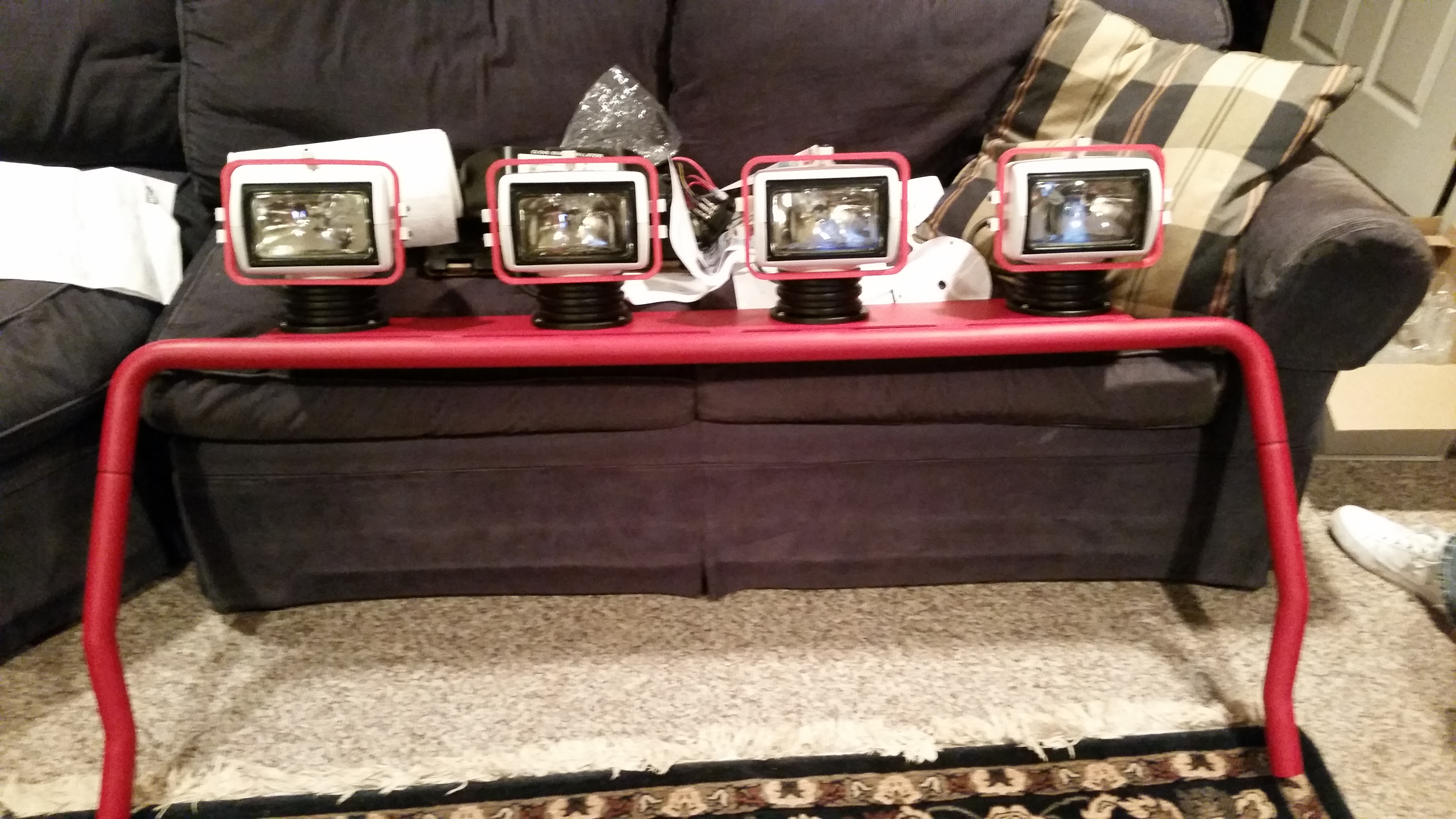 Finally finished adding all the accessories to the lights, and got them mounted on the bar. Next comes mounting the bar on the jeep, and the mounting solution for the 4 light controllers. Turning out very nicely!