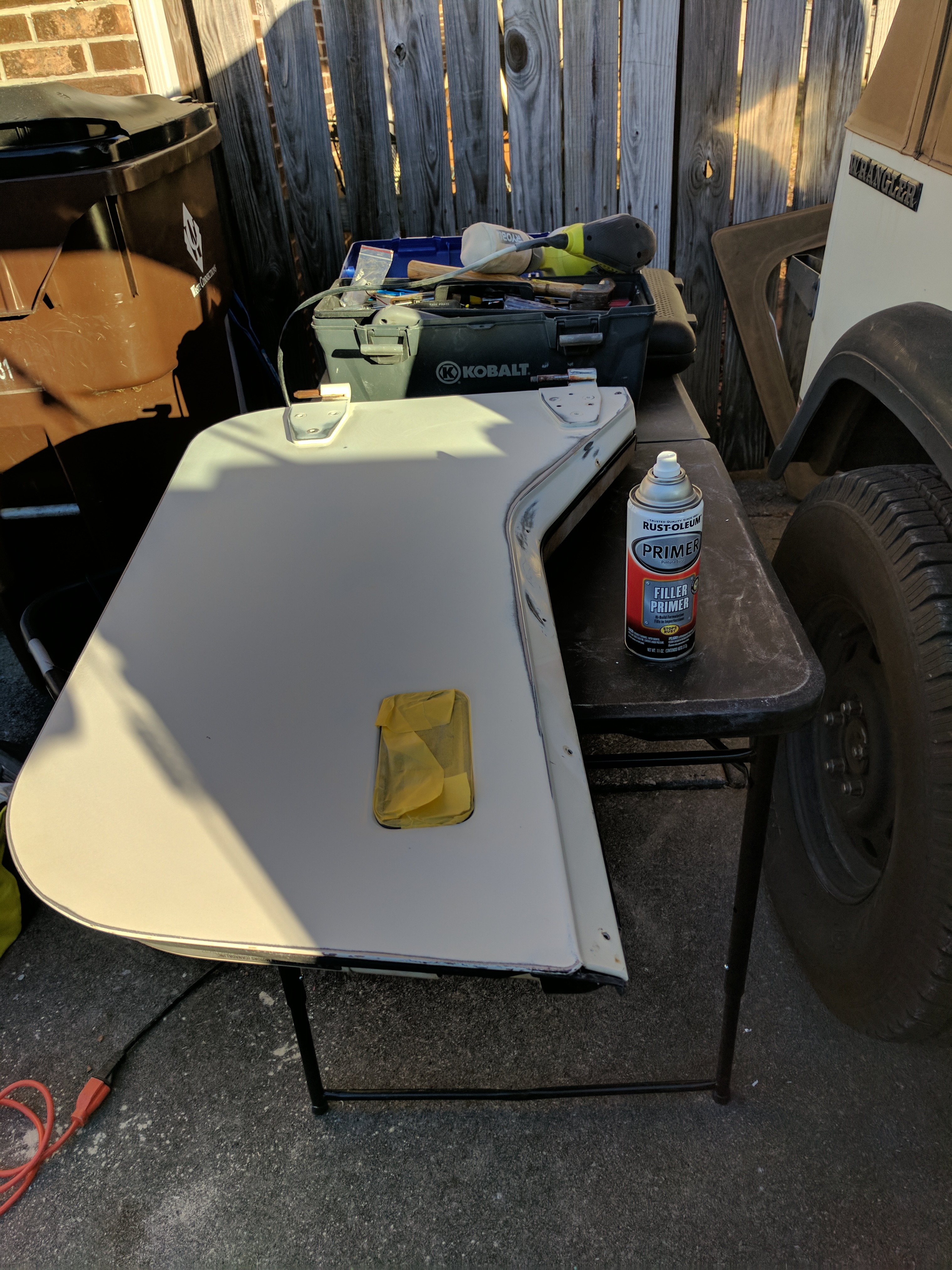 I was able to remove, sand, and prime the doors today. It took two coats of primer spray to make an even coat. I was able to talk my better half into going to home depot to get Paint, Primer, Sanding Circles for my sander, and some necessary tapes and plastic... I was also able to pick up some speakers for cheap, and a new horn at a pickNpull type place.
