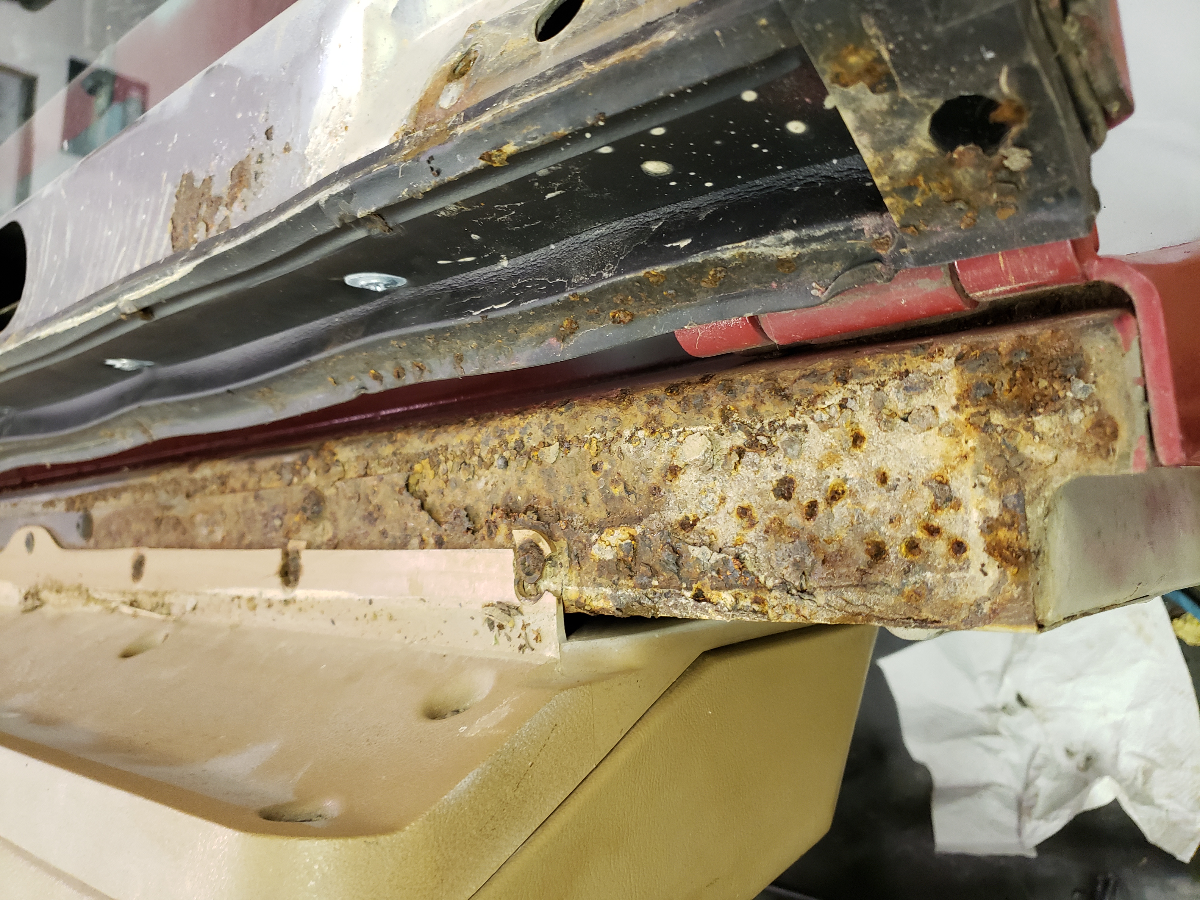 oh no! when you said windshield frame i was thinking the glass section. Is that black piece on the glass section covering up rust? That looks like something that was slapped on over the rust. Lots of builds require a new frame but that rust on the dash side is another story.