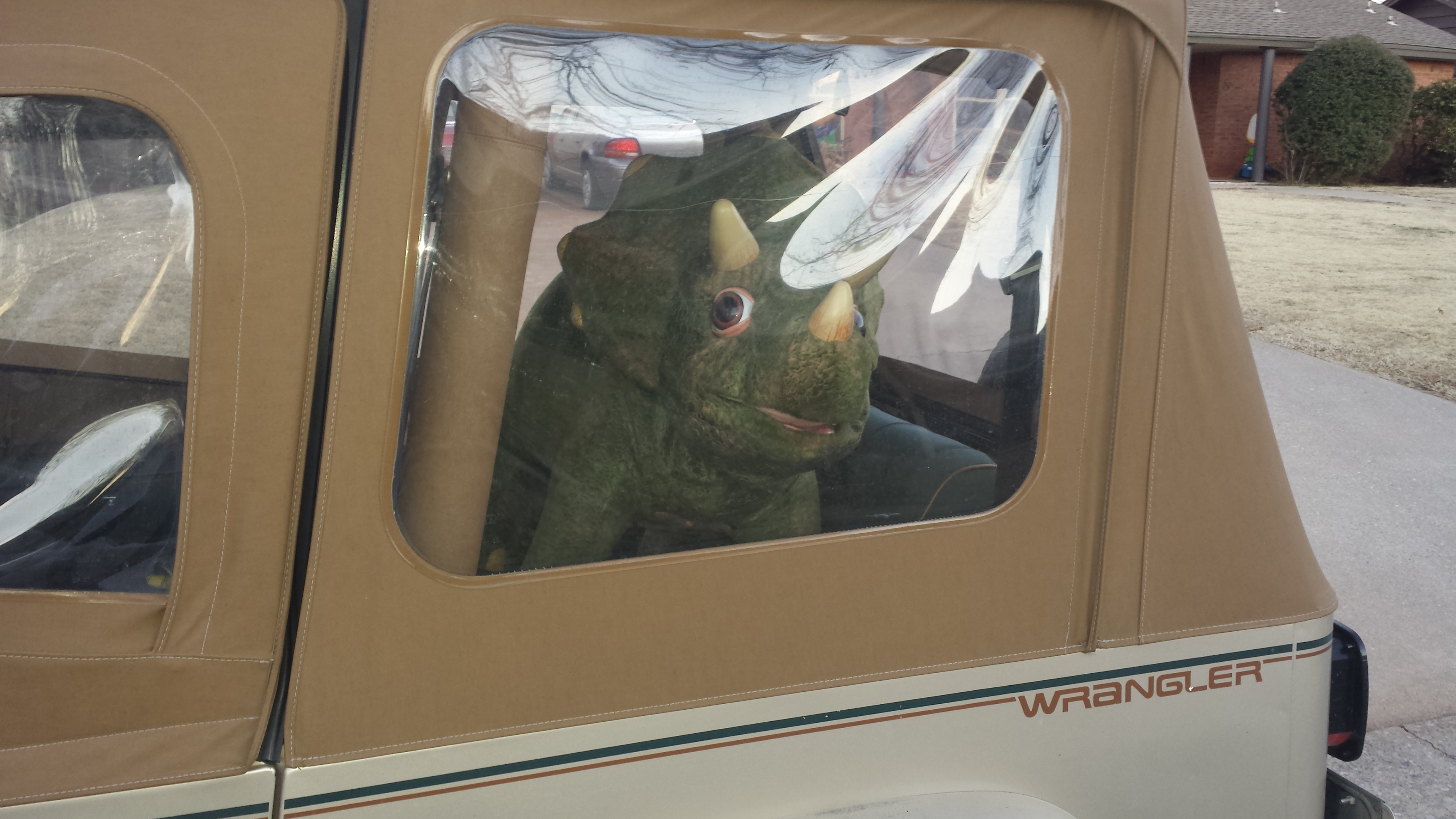 Okay so I know that some of you have become extremely disappointed at the fact that during a rain storm you have not encountered a Dilophosaurus in your Jurassic Park Jeeps. Even if it had the number 12 on it. Nor have any of you come across a T-Rex trying to destroy your tour vehicles. However today while I was out I came across a baby Triceratops who needed a good home. So I picked him up and put him in the backseat of the Jeep. Oddly enough I received all kinds of weird looks on the way home. I mean I know I haven't painted my Jeep yet or put on my decals, but I kind of thought it was completely natural for someone to transport a baby Triceratops in the back seat of a Beige YJ Sahara Jeep with a spice soft top. Anyway got him home safe and of course he enjoyed the ride. I think he will probably go on road trips with us quite a bit in the future.