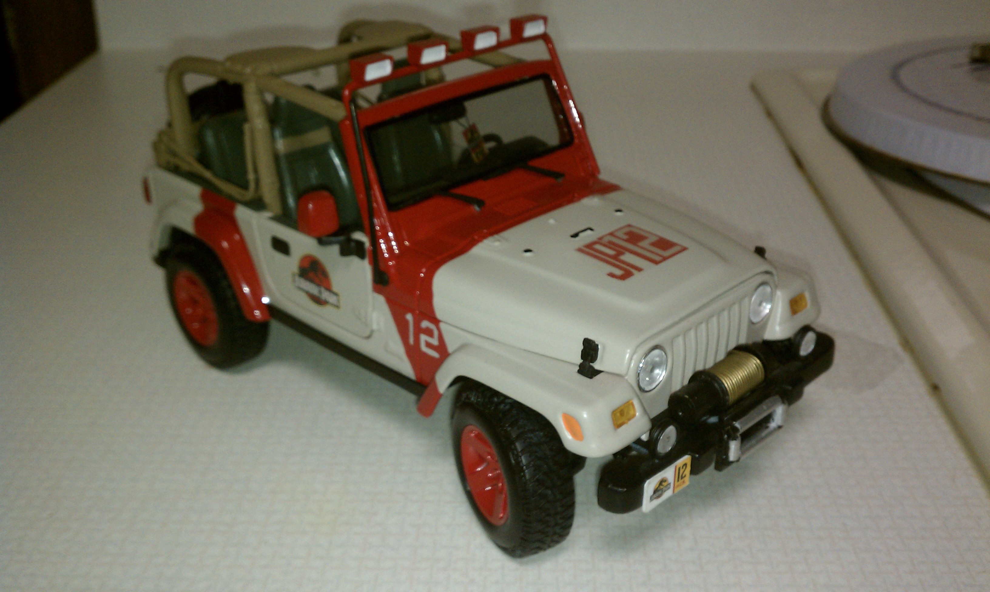 I love the JP cars. I have a large collection of 1:18 scale movie cars, some made by various companies, some custom made. I started with a white 2003 Wrangler Rubicon model by Maisto. The light bar, lights, and winch were custom made. I still have some finishing touches to go, such as the rear amber lights, the CB antenna, and the decals. I went with the olive interior, because I like it better than the hunter green. I also bought a 2007 Explorer model that will be started soon, if I can ever figure out how to make the clear plastic bubble for the roof. The 2007 was the only 1:18 model I could find...
