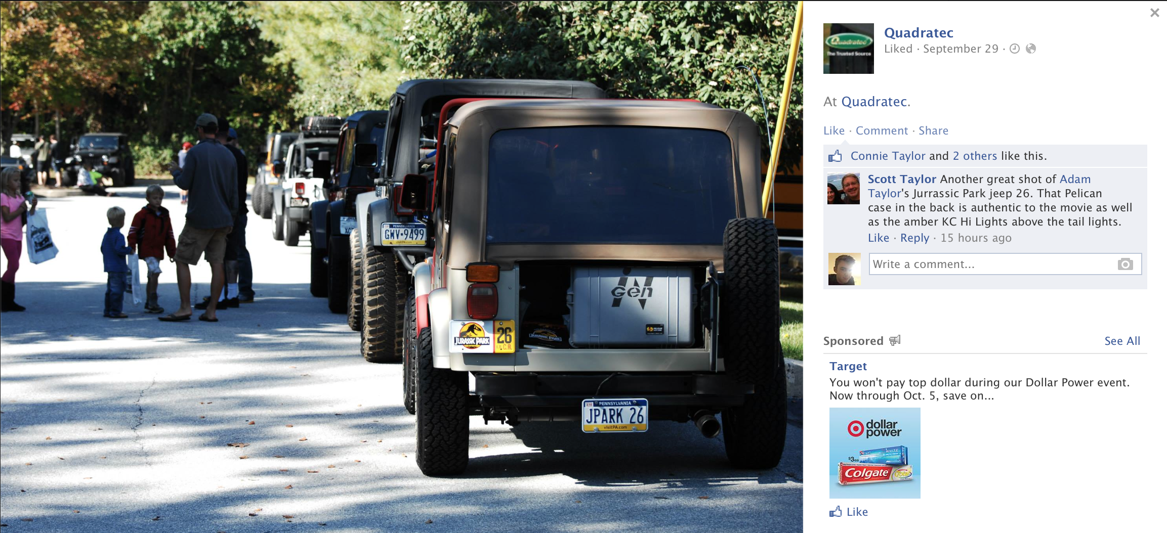 Well I have been at school, my parents have been taking the Jeep around for shows. It attracts so many crowds, I was shocked. The most recent one was at Quadratec's headquarters. They loved it! They even posted pictures on there Facebook. I am most likely going to be featured in their tent sale coming up in October. Also, my Jeep has been popping up all over Instagram and Facebook (thanks to Jaredotte for finding them). Here is some more photos.