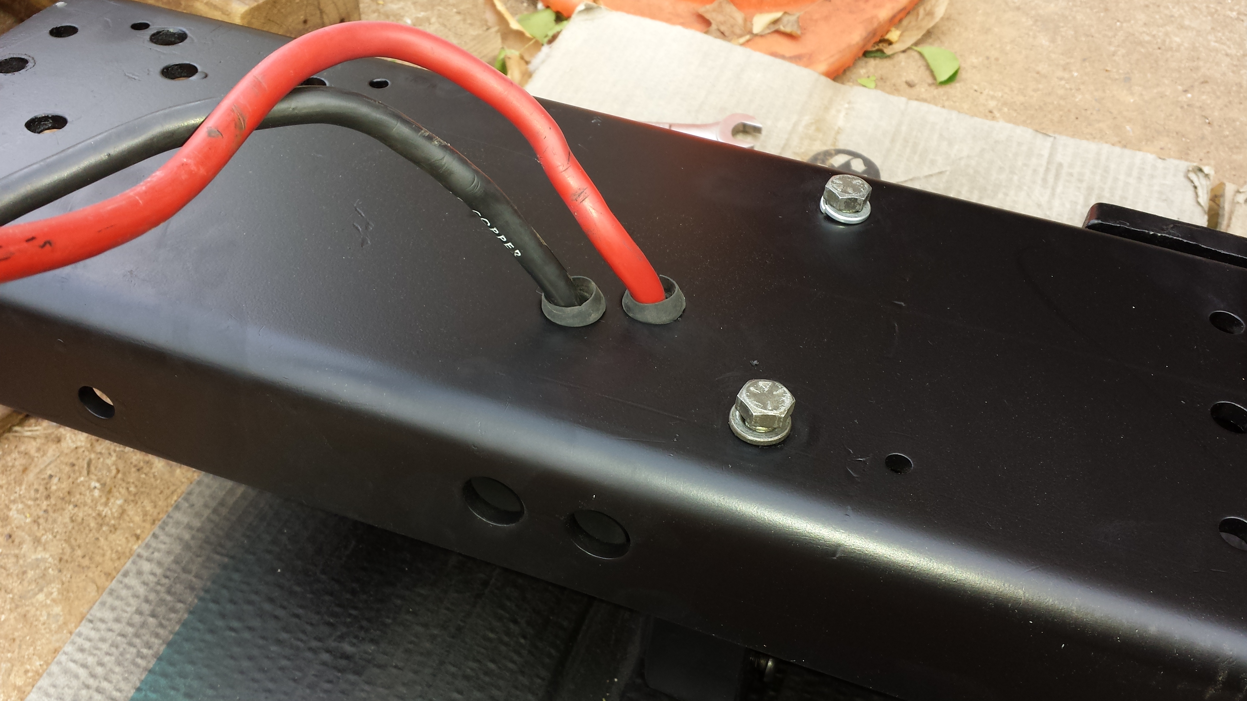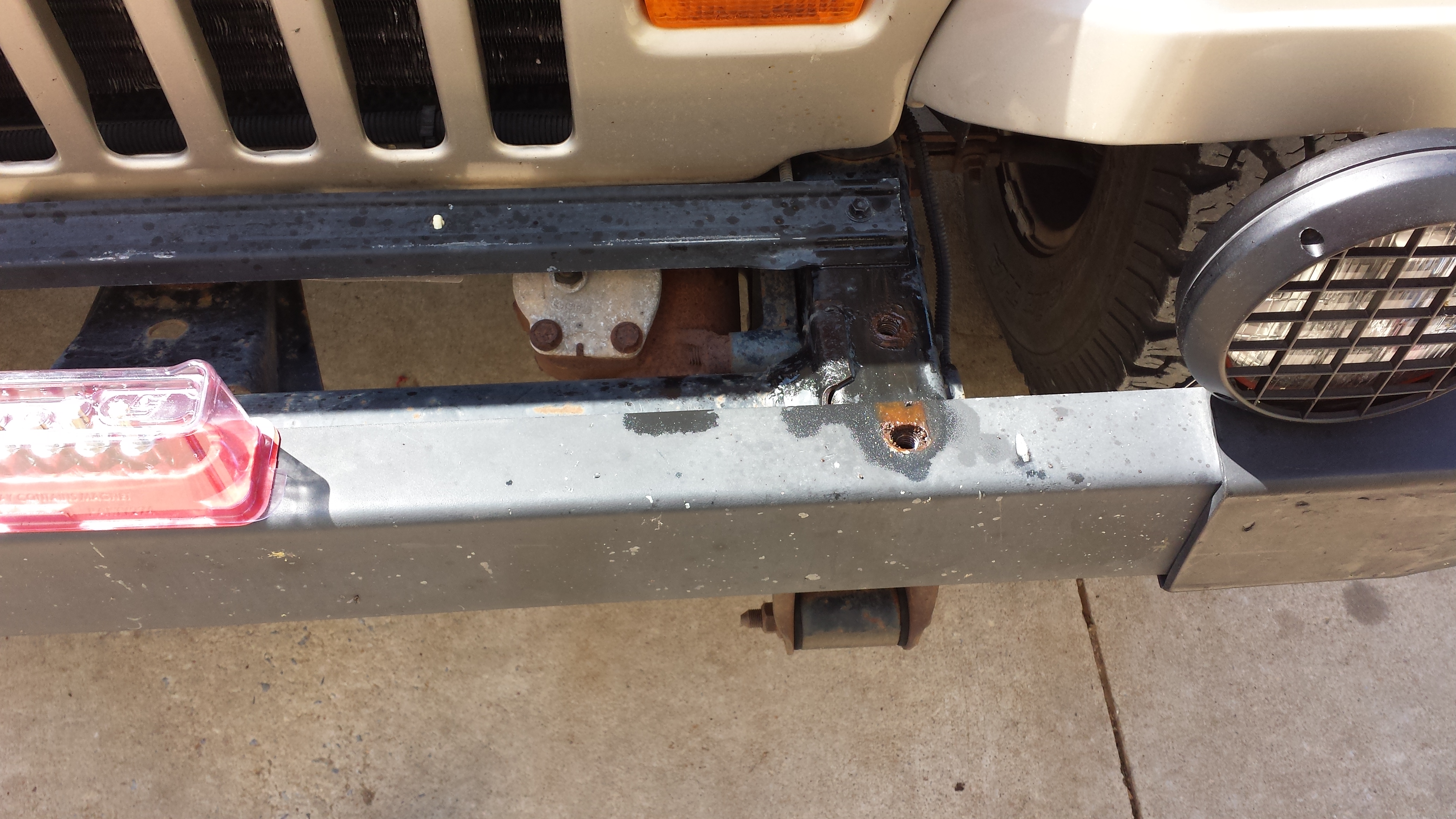 During my test fitting and installation I ran into a couple of problems. The first one was that my mounting plate was a kit made for the Ramsey REP 6000 and CJ Jeep. Apparently the CJ frame bolt holes and the YJ bolt hles are different. The CJ used a bracket that bolted to the sides of the frame, where as the YJ mounts to the top of the frame where the tow hooks were mounted. Because of this I had to measure and drill new holes that would line up with the YJ mounting locations.