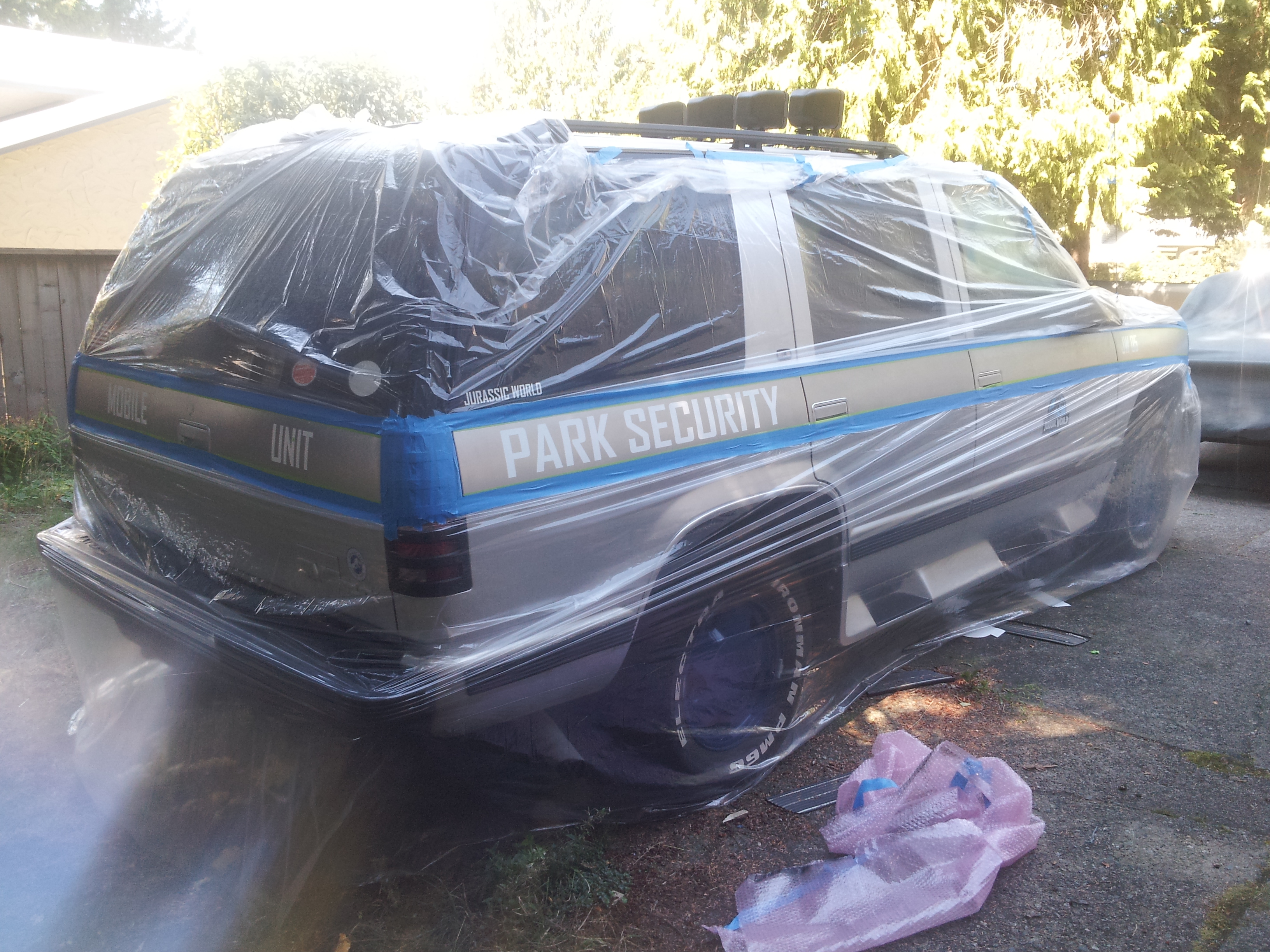 So the blue square on the hood is where I plan to put a Jurassic World Logo. Same for the front 2 doors, will also put a Jurassic World Logo. The blue tape along the size will be a guideline for a blue stripe. At the back it will say "Park Security" in silver over the blue stripe. Also in the blue stripe on the front fenders I think I will put "JW05" in silver. Let me know what you guys think, or if you have any cool ideas!