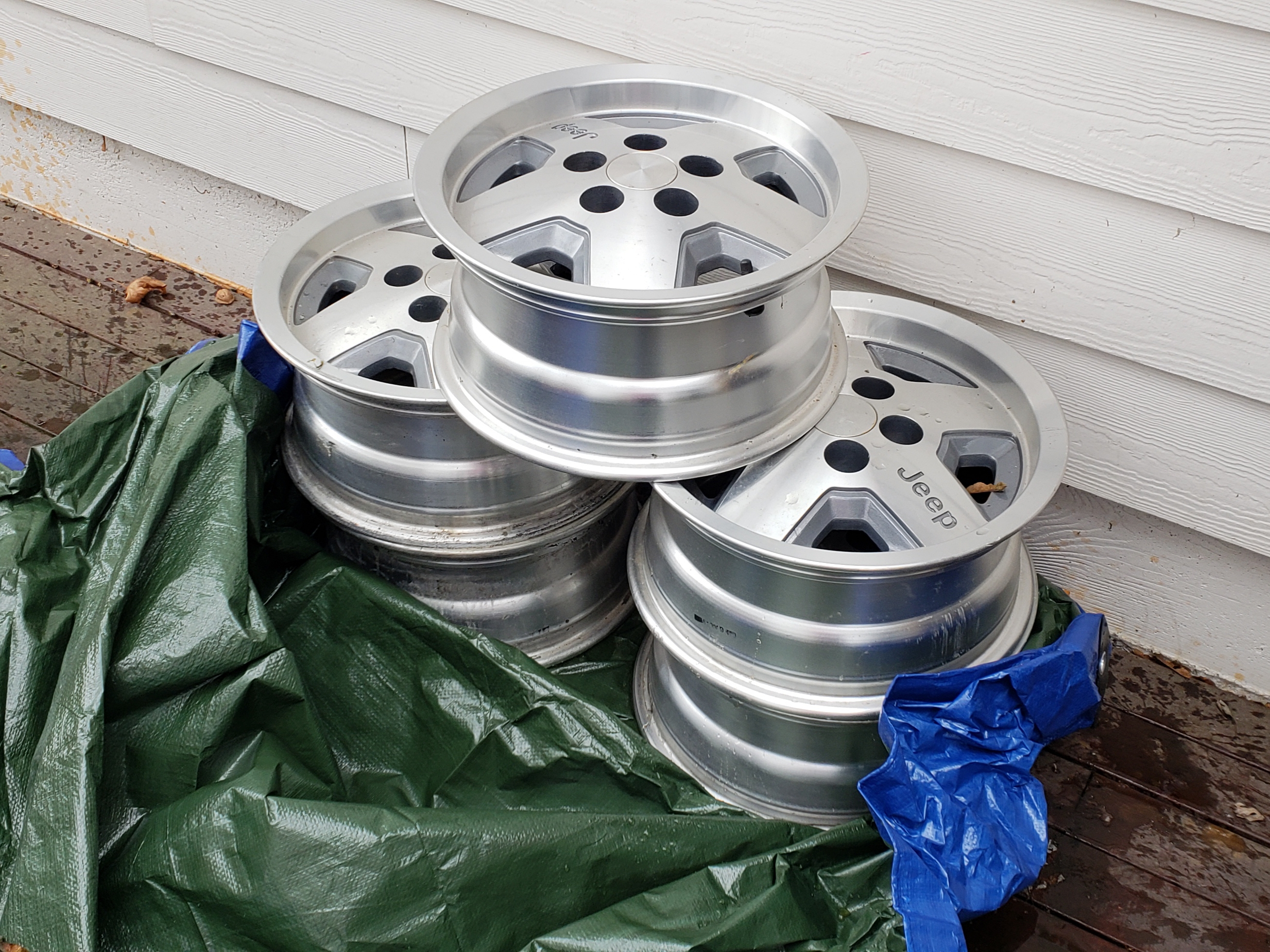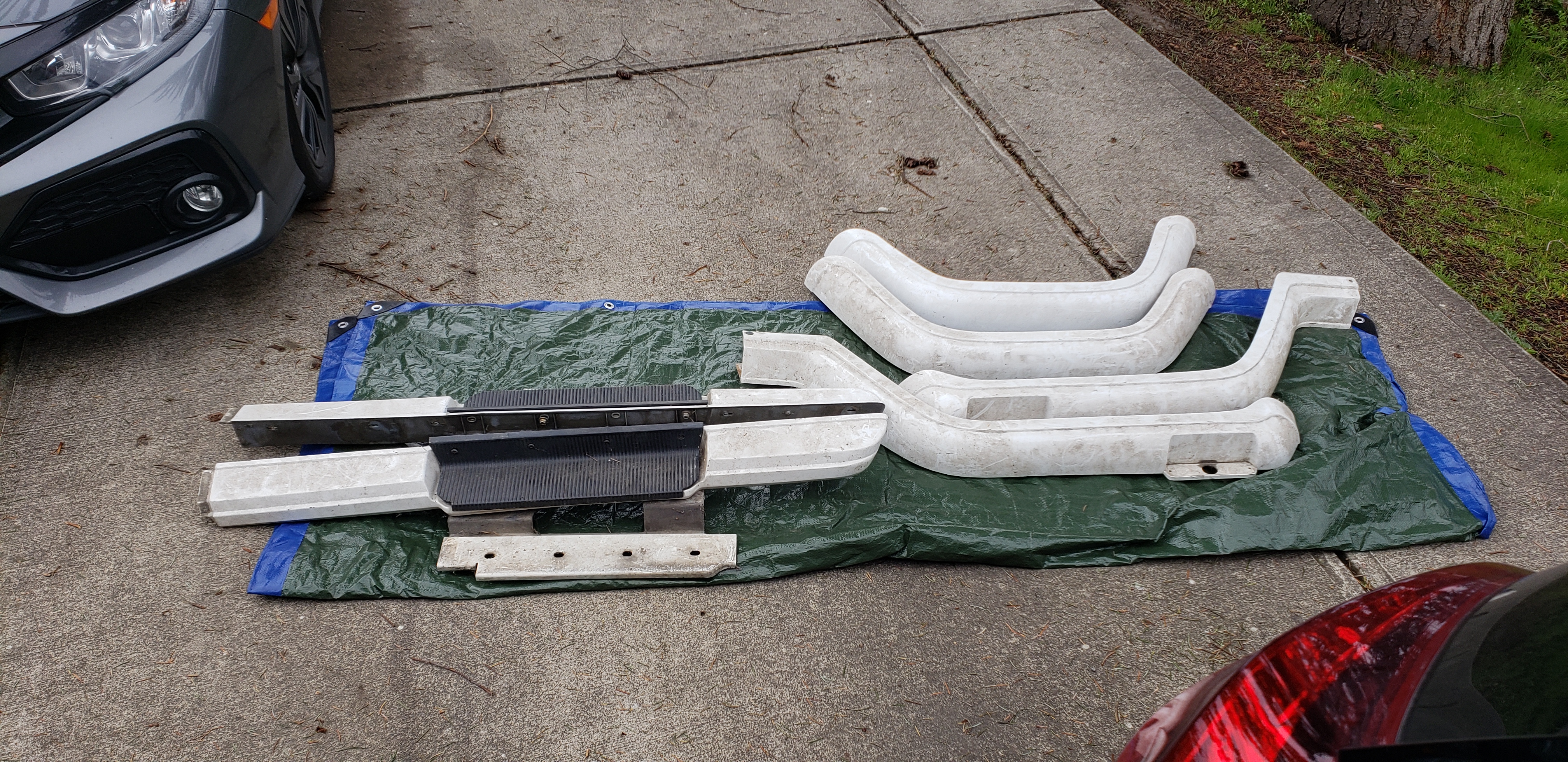 While I was outside organizing things today, I figured I'd take a few photos of the odds and ends that I've gathered so far. Pictured is the set of 5 stock wheels I picked up for around $125 on CL, the amber fog lights that were a freebie (not right, obviously, but hey they were free), and a set of fenders that I got for around $80 from a guy on FB Marketplace. Obviously I only need the steps, so I'll probably sell off the fenders themselves.