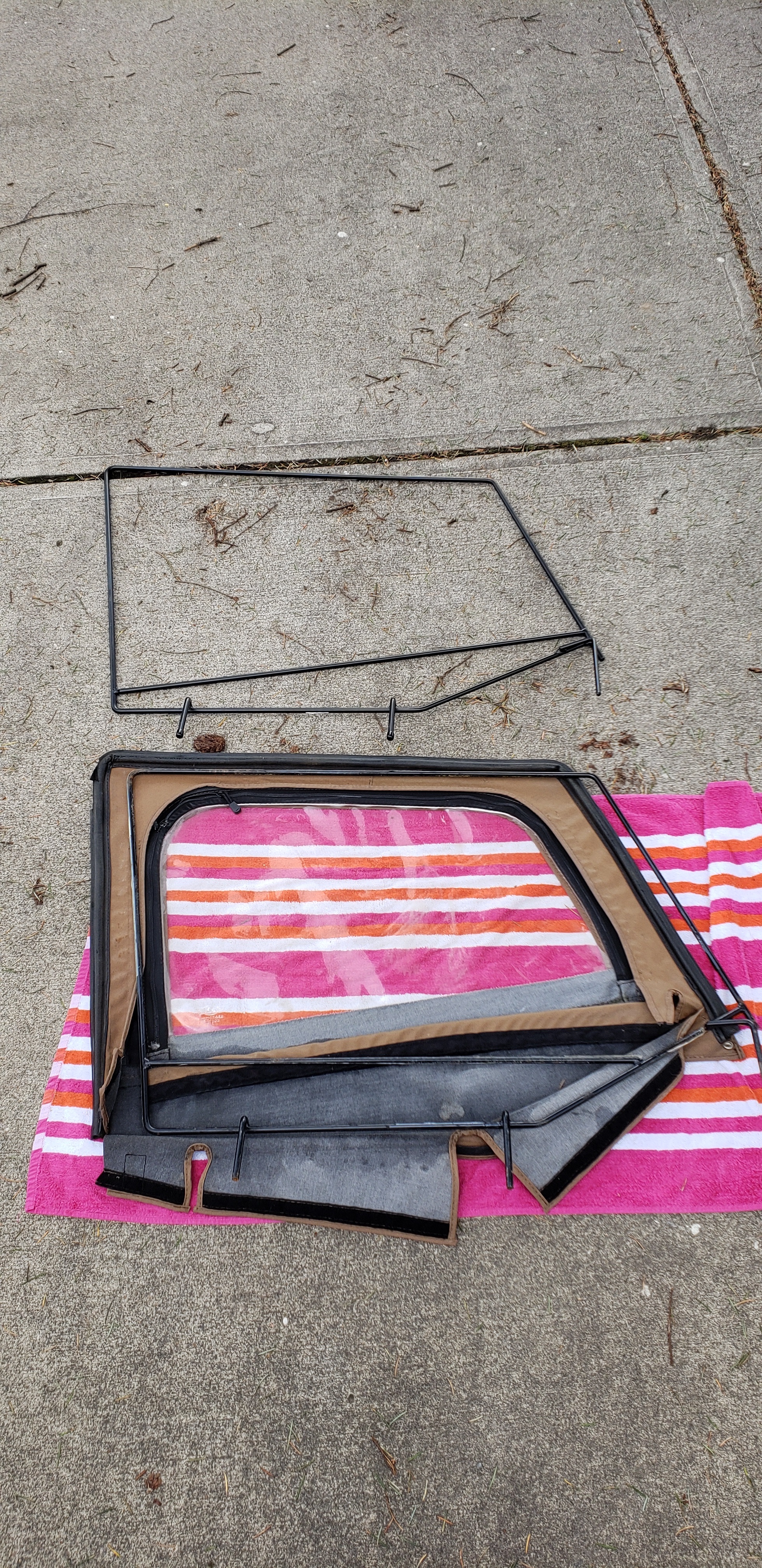 I purchased a new set of window frames. I've laid the old frame on the panel to show how the cut of the fabric doesn't line up with the angle of the bar. The new frame is laid above, and you ca see the angle of the bar actually matches the fabric. I'm not even sure what brand of soft top would fit on the old ones. Maybe one of those slider windows? It was also nice to let the soft window panels fully dry in the sun. It's been a very wet spring here in Oregon.