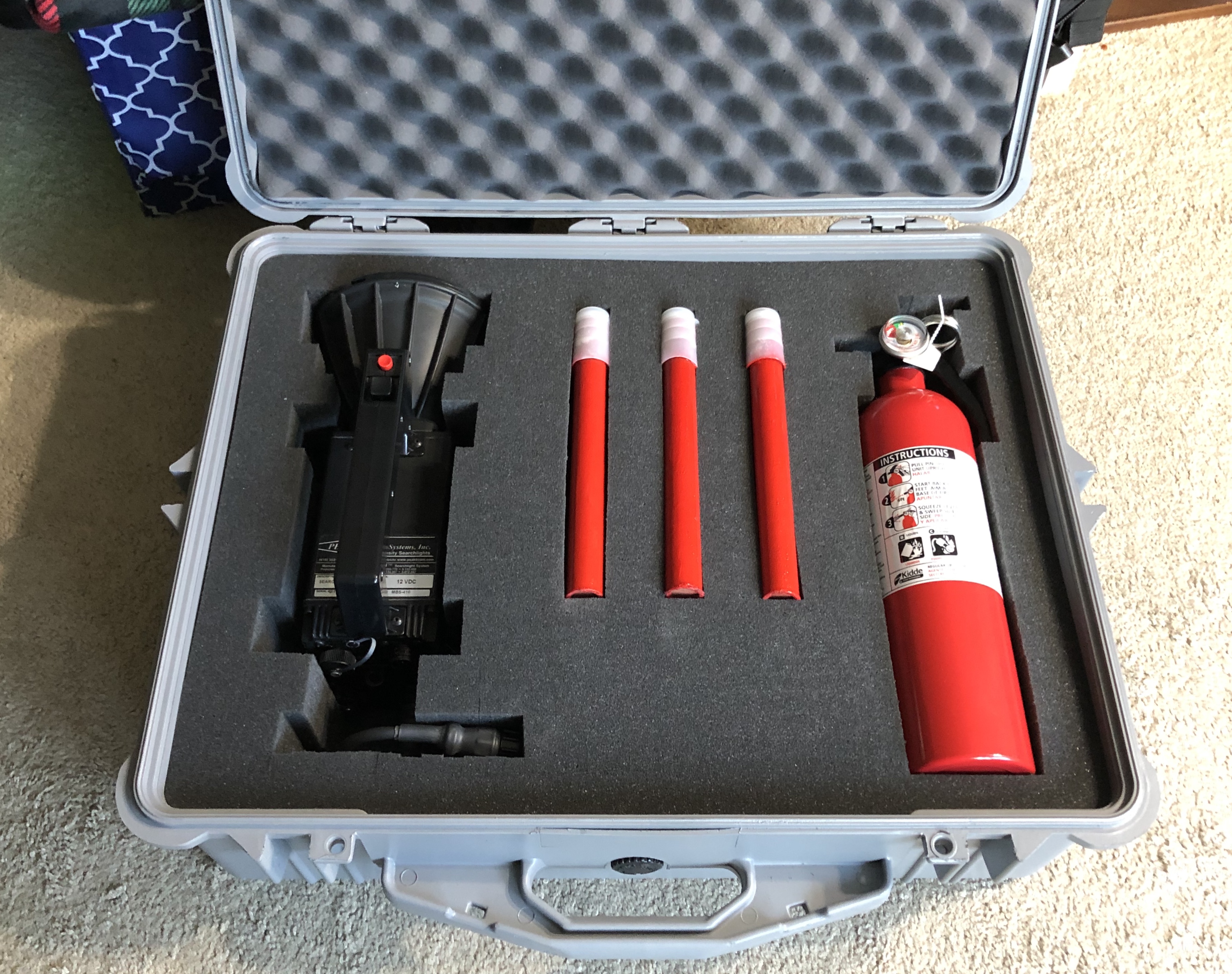 I found a black pelican 1600 case, re-foamed it, painted it, and then filled it with 2/3 accurate items. Flares on top are painted with the ones beneath still original. I know it’s not 100% accurate, but again who wouldn’t want to have these items in their vehicles anyway? Haha.