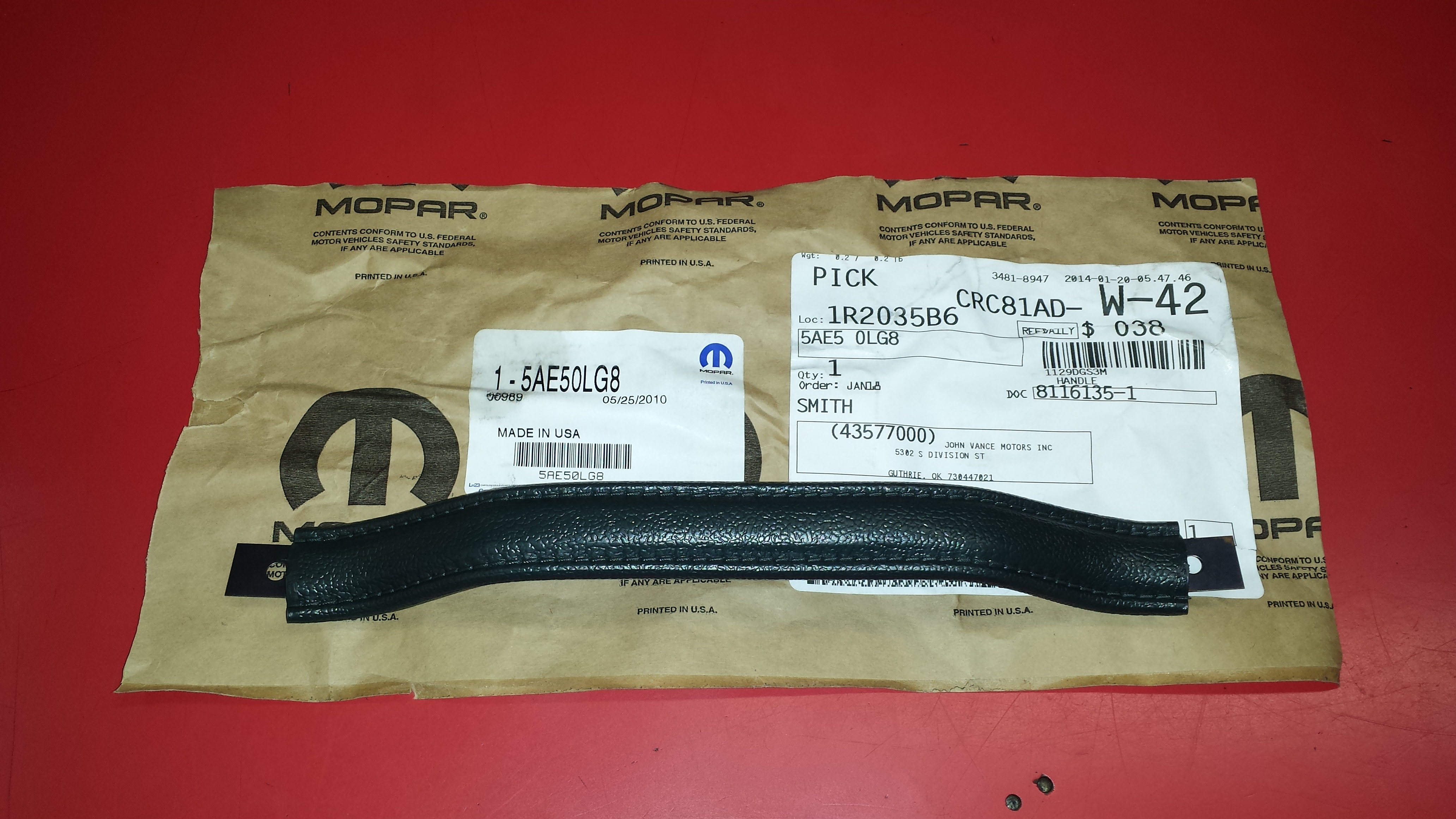 So I picked up the replacement door handle and changed it out. The previous owner had taken some green webbing and put it in place of the broken handle, but I wanted it to be factory original. As you can see from the pictures it was a Mopar original part and the color matches perfectly.