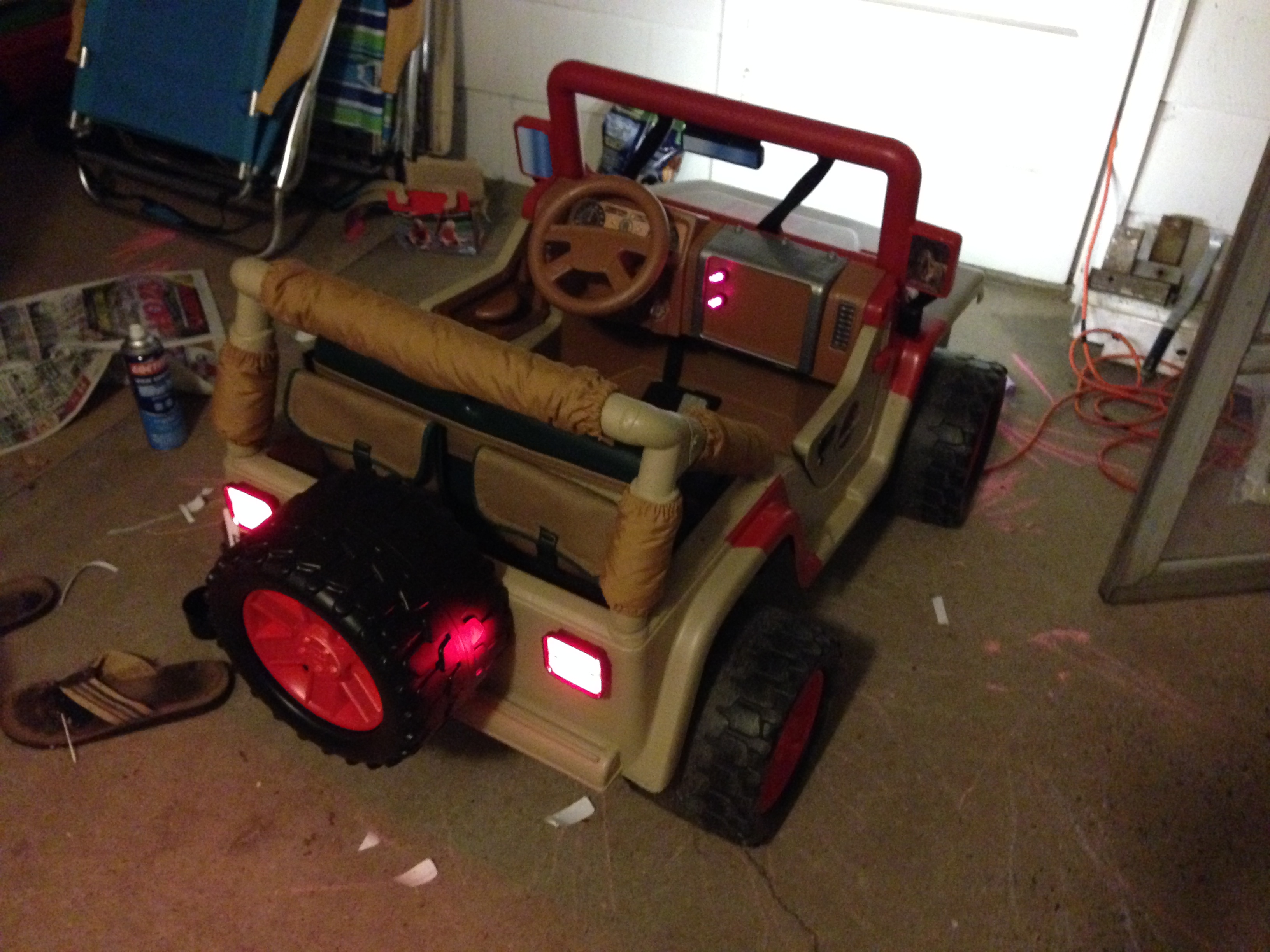 Well her birthday was on Wednesday, but I'm not going to give it to her until her actual party on Saturday (not that she's really even capable of driving it yet anyways). But anyways, just finished up the wiring for the lights tonight. All that's left is to mount the spare tire, license plates, and put in the seat. Also need to finish editing, printing, and applying the decals. I'm using avery shipping labels so hopefully they work out well.