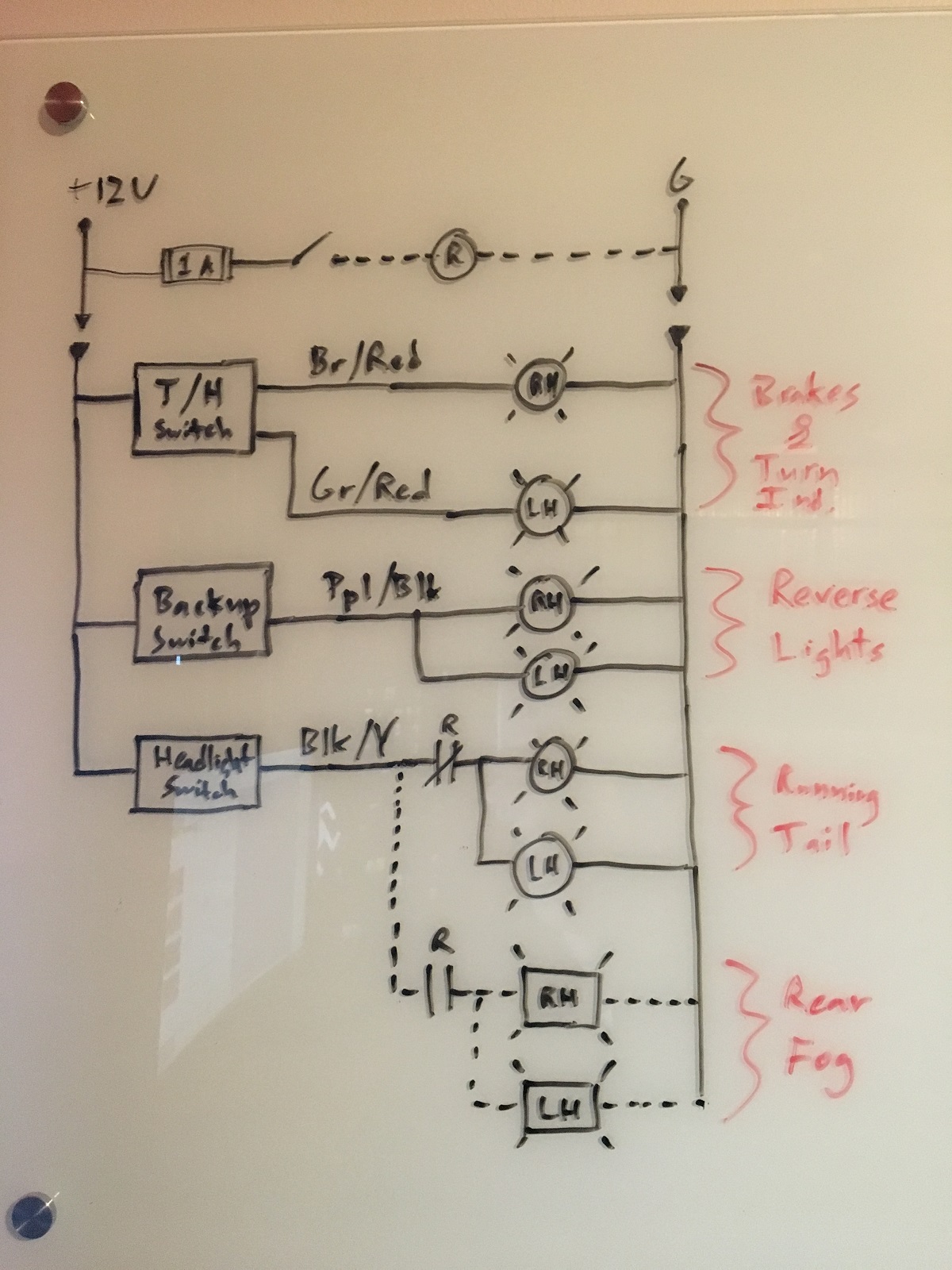 I also sorted out my tie in points for the rear fog switchover relay. I used the factory wiring diagrams as a reference. I can honestly say, after working with ladder schematics for so long, I've come to hate point-to-point wiring diagrams with a burning passion. Also... the Jeep engineers need to get their proper color consistency/conventions together, one page says "Purple/Black" wire the next says "Violet/Black". Well guys, which is it? Someone go back to the early 90's and teach them modern manufacturing quality control methods.