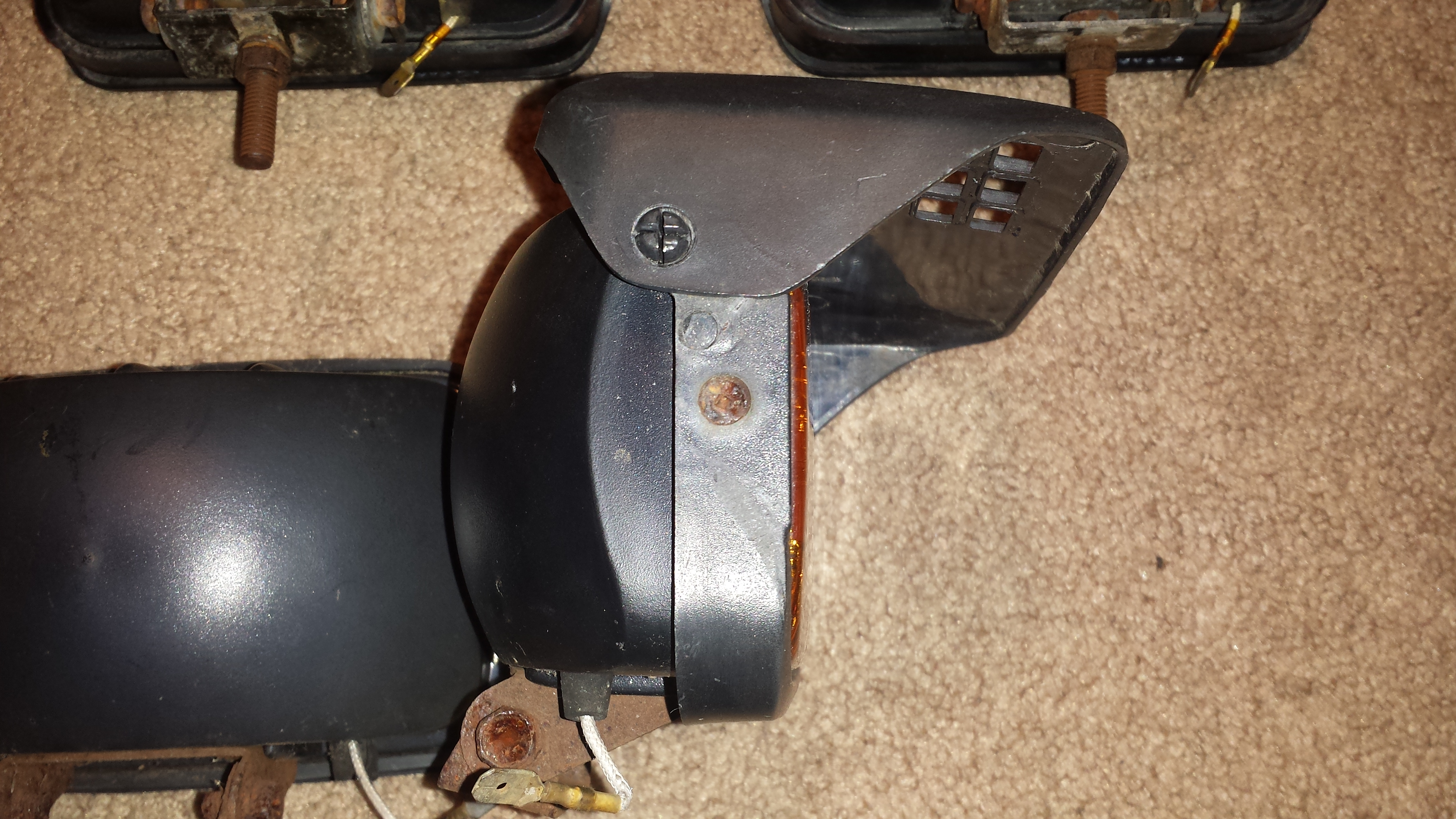 The amber ones I won off of eBay. I bid on them before I had the trade deal for the clear lensed ones worked out, but since I was worried that one or the other might not go through, I aimed for both. Luckily I got both. The amber ones are rough. The metal on them is so rusted that the screws that hold everything together on the sides are not recognizable as screws anymore. I am a little worried about taking them apart to restore them. I know you might say, "Hey you have two sets, if you mess one up you should still be able to make two for the Jeep." And you are right, but since I know how hard these are to get. I do not want to damage anything more than it already is. I will post pictures with my progress when I get the time to play with them. I have also ordered some parts and have come up with what I think is going to be a unique way to wire them where I can run them any time I have my headlights on. I will post that also with a detailed description of how to do it.