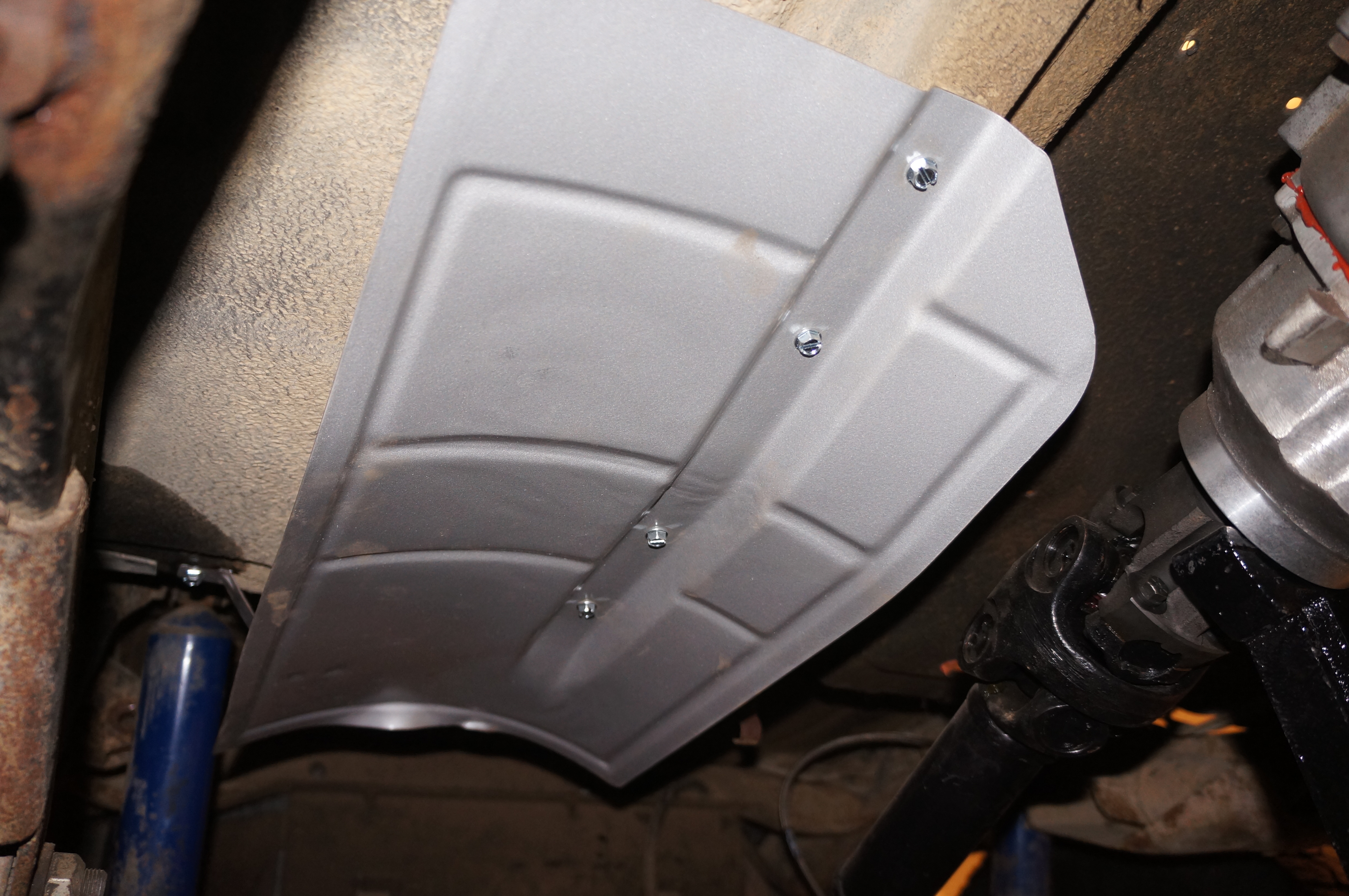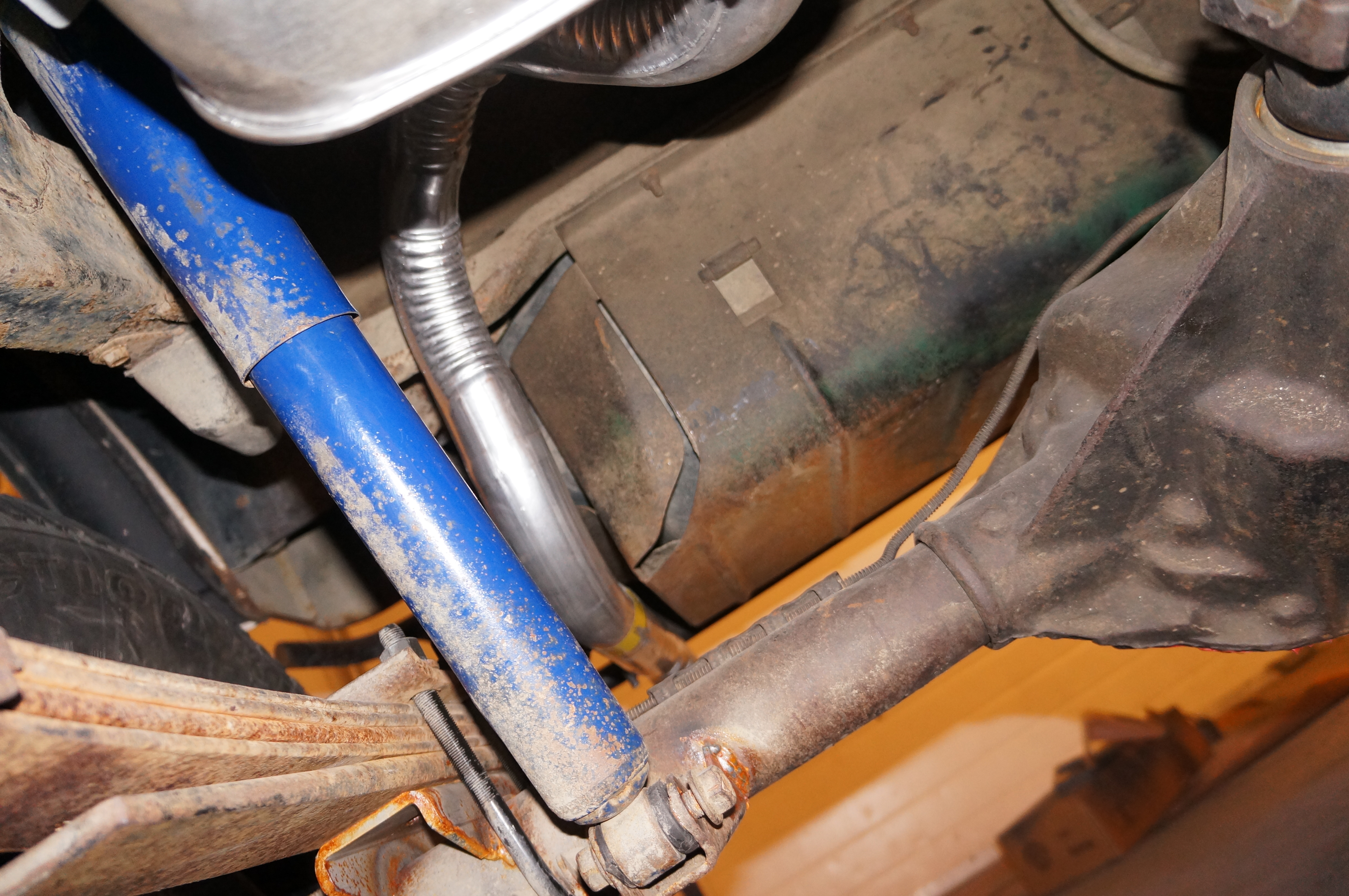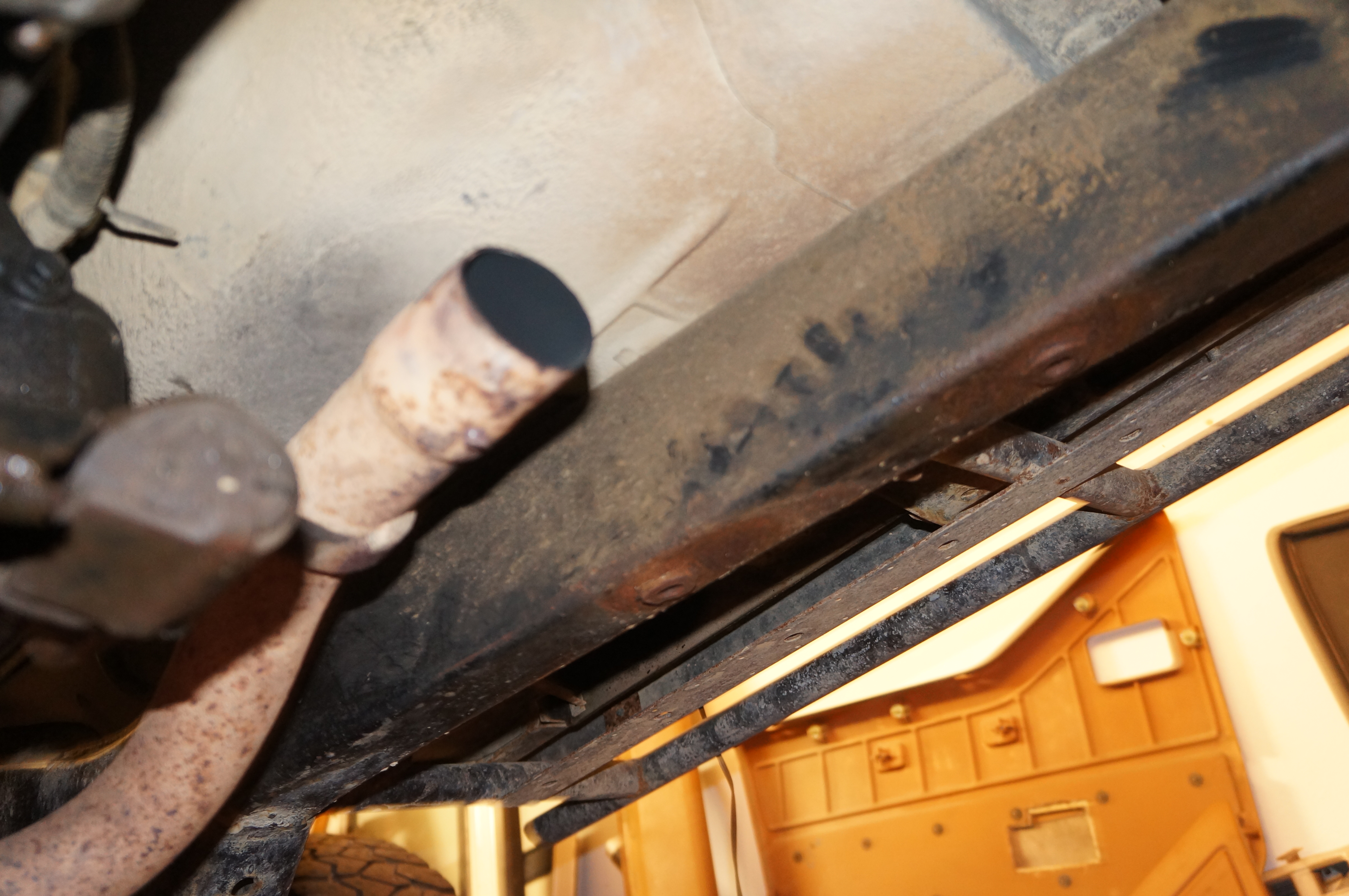 Put a jack stand on the mount for the rear drive shaft and then on the front near the bell housing so I could get the skid plate off. (the whole purpose which I have failed to mention is that I am putting on a catalytic converter since one is currently not there.)