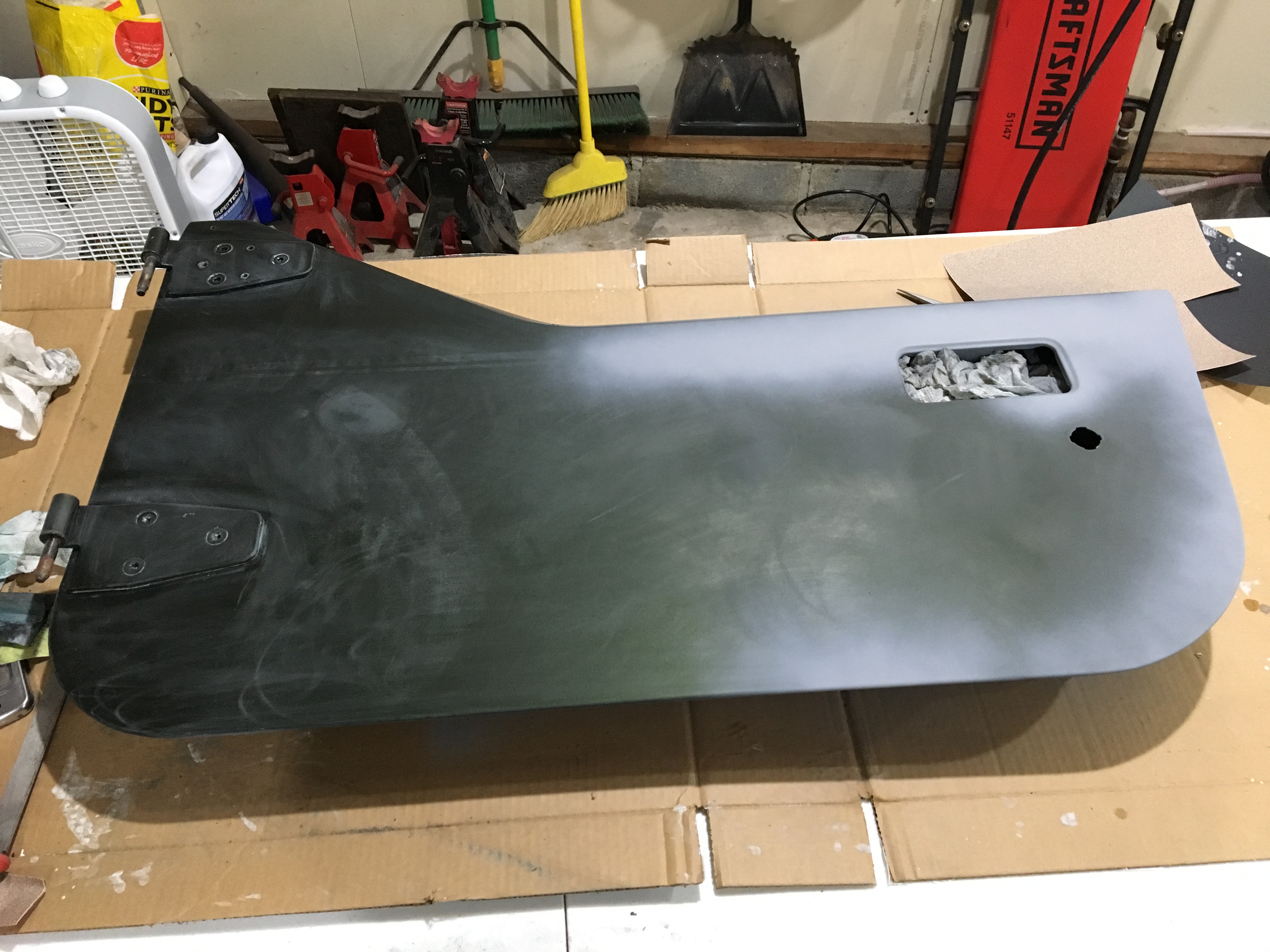 The holes for the CB antenna were drilled out with a pilot and finished with titanium nitride coated 1/4" bit and a step bit. I often use cutting oil to extend the life of the bits. Cleaned up with a file and ready for primer. The old door entry guards were long gone, with the hardest sticker residue I've ever come across left in its wake. This was a nightmare to remove and I basically had to take it down to bare metal. Lots of scraping, Goo Gone, 40 grit sandpaper followed by 120 grit and 320 grit. I'll replace them with new entry guards in the future, but will try to find some that screw in rather than glue. With prep work complete, I was ready for primer and paint. The shop recommended Evercoat Dura Build primer, and I'm happy they did. It works great to build up a layer, and sands extremely easily.