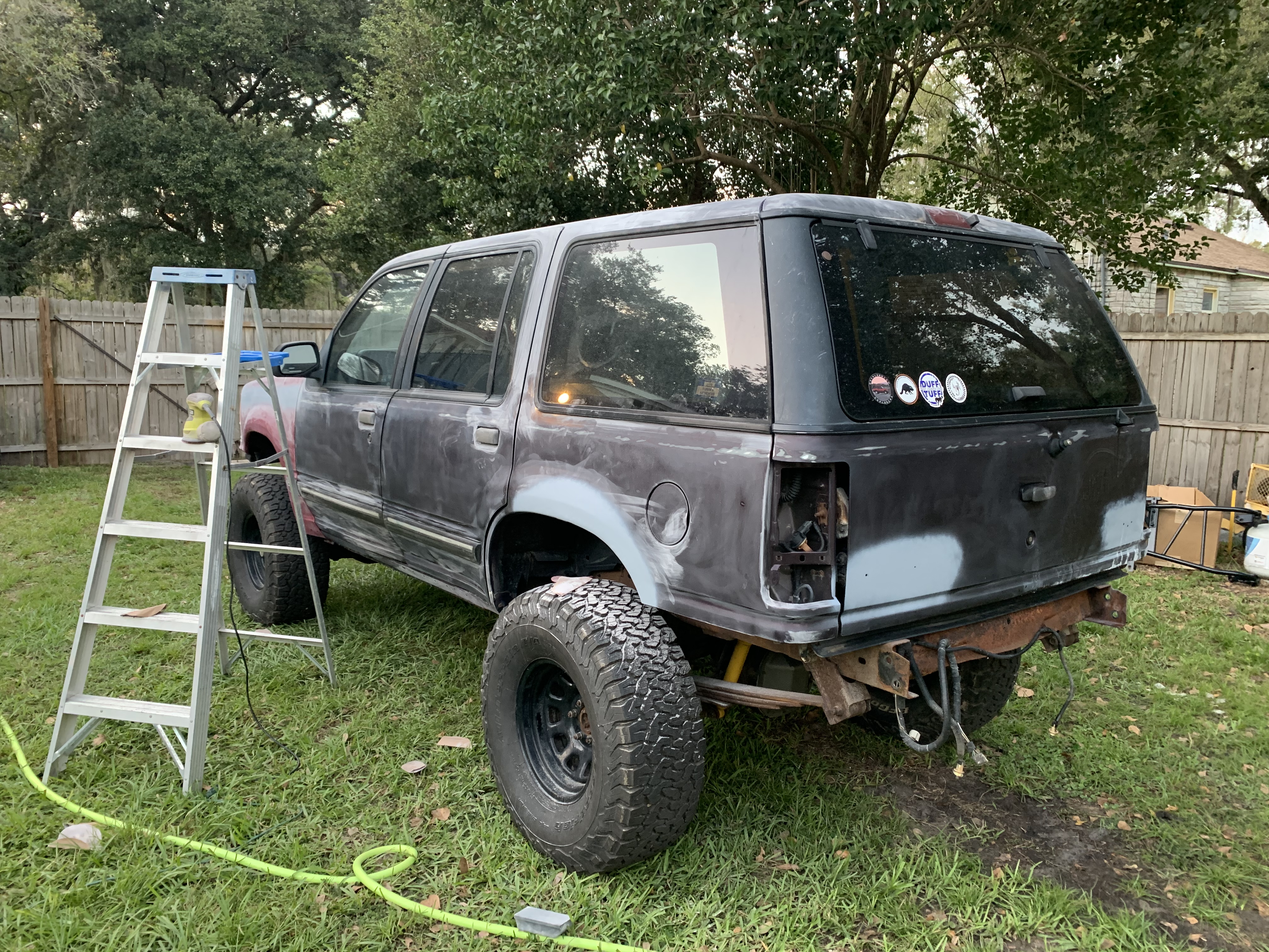 Since no one makes a nice looking off road bumper for the explorer I decided to get a weld it yourself kit for a Jeep XJ. Had to move the mounting points inward but the outcome was perfect. Also replaced the drivers fender, lower valance and headlight bezel. It stayed this way for a few months with the addition of a winch. We took it out to Citrus Wildlife Management Area a few times off roading. It did great but the front suspension was getting tired. Also the lift bracket punched a hole in the top of my front diff.. I know I know.. lift brackets suck! Lol. Then it got a little more serious. I decided after getting my Bronco II that I’m building back from paint that I wanted to learn how to paint. (Because I hate the outcome of my B2)