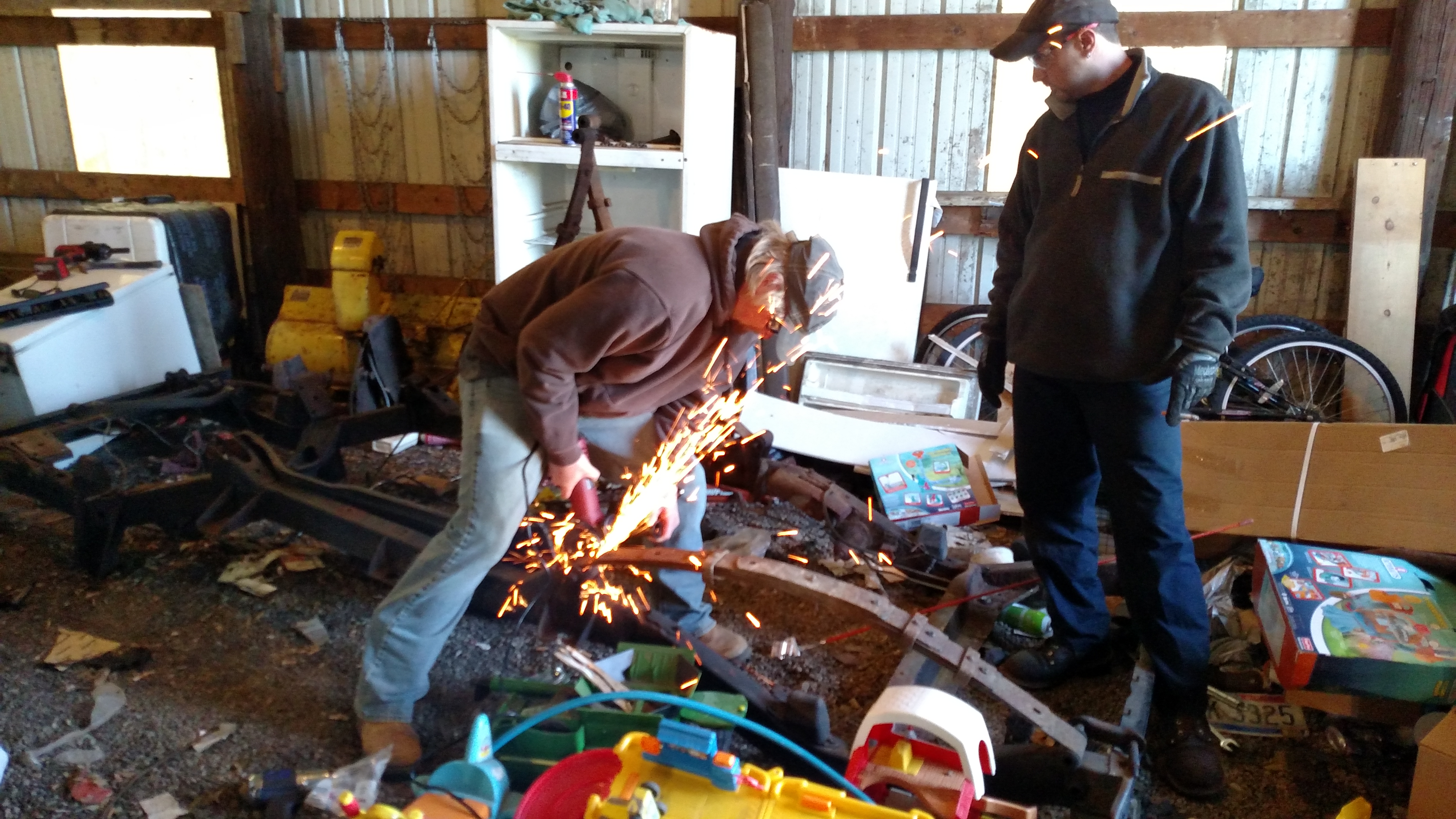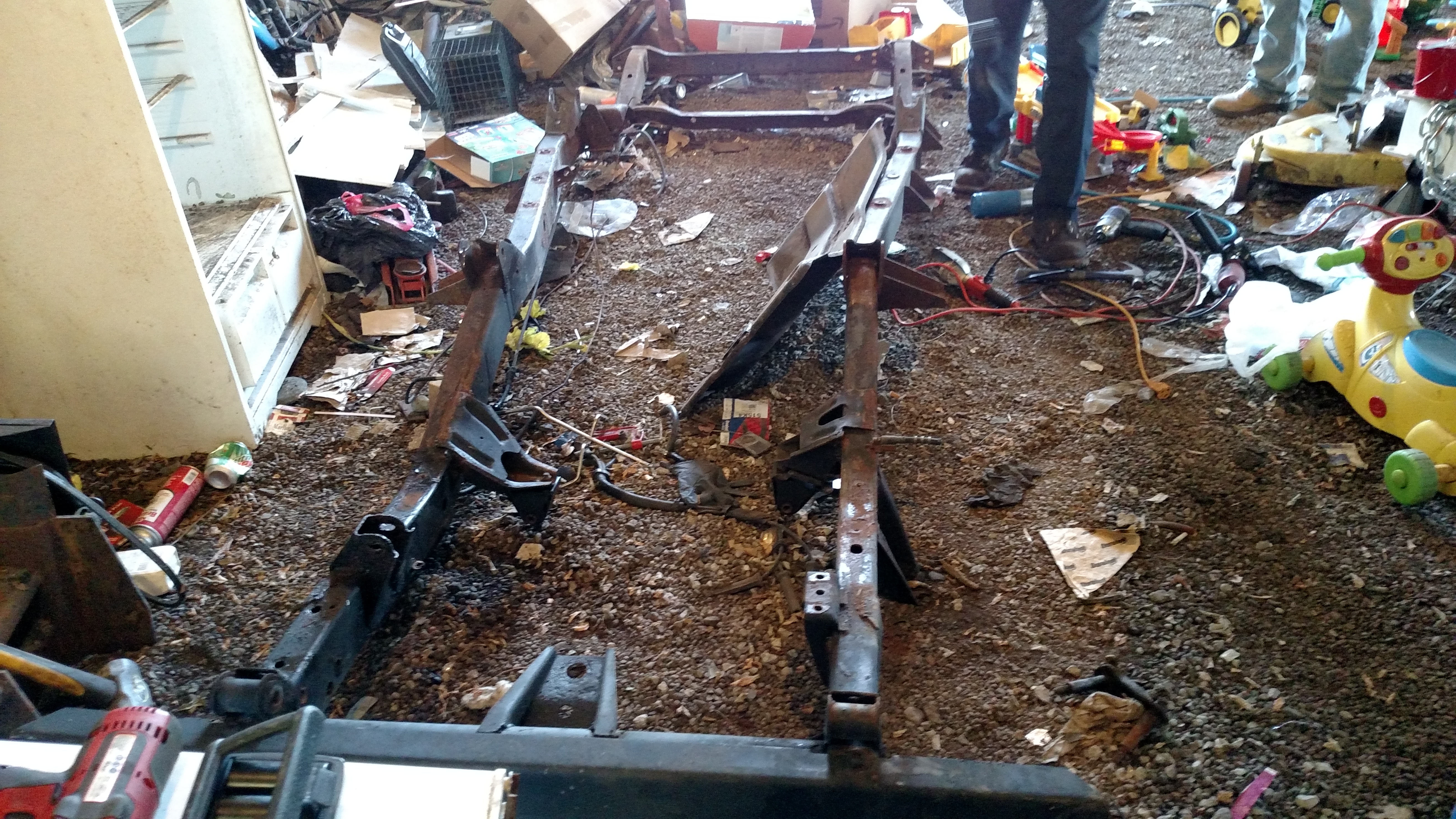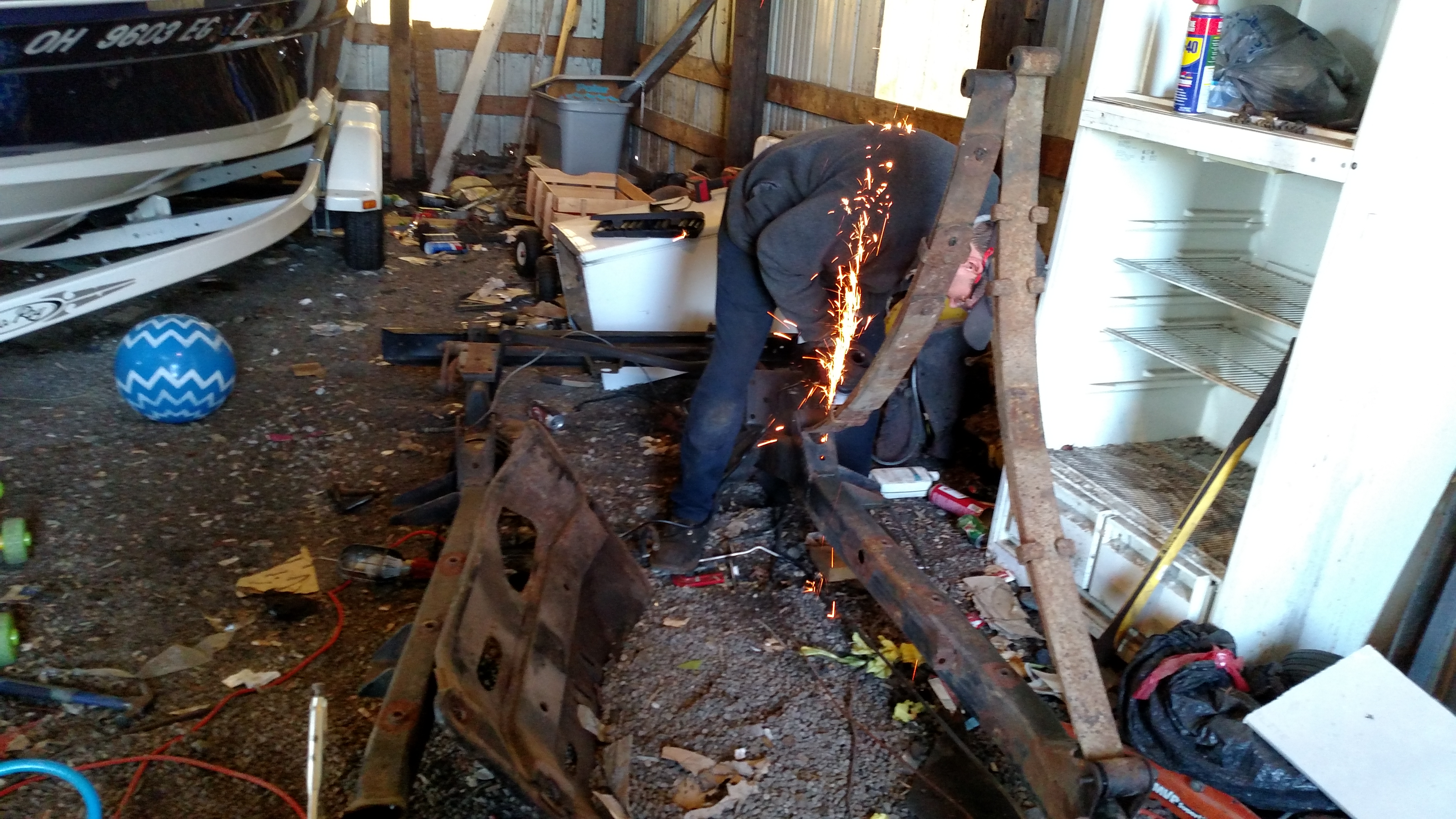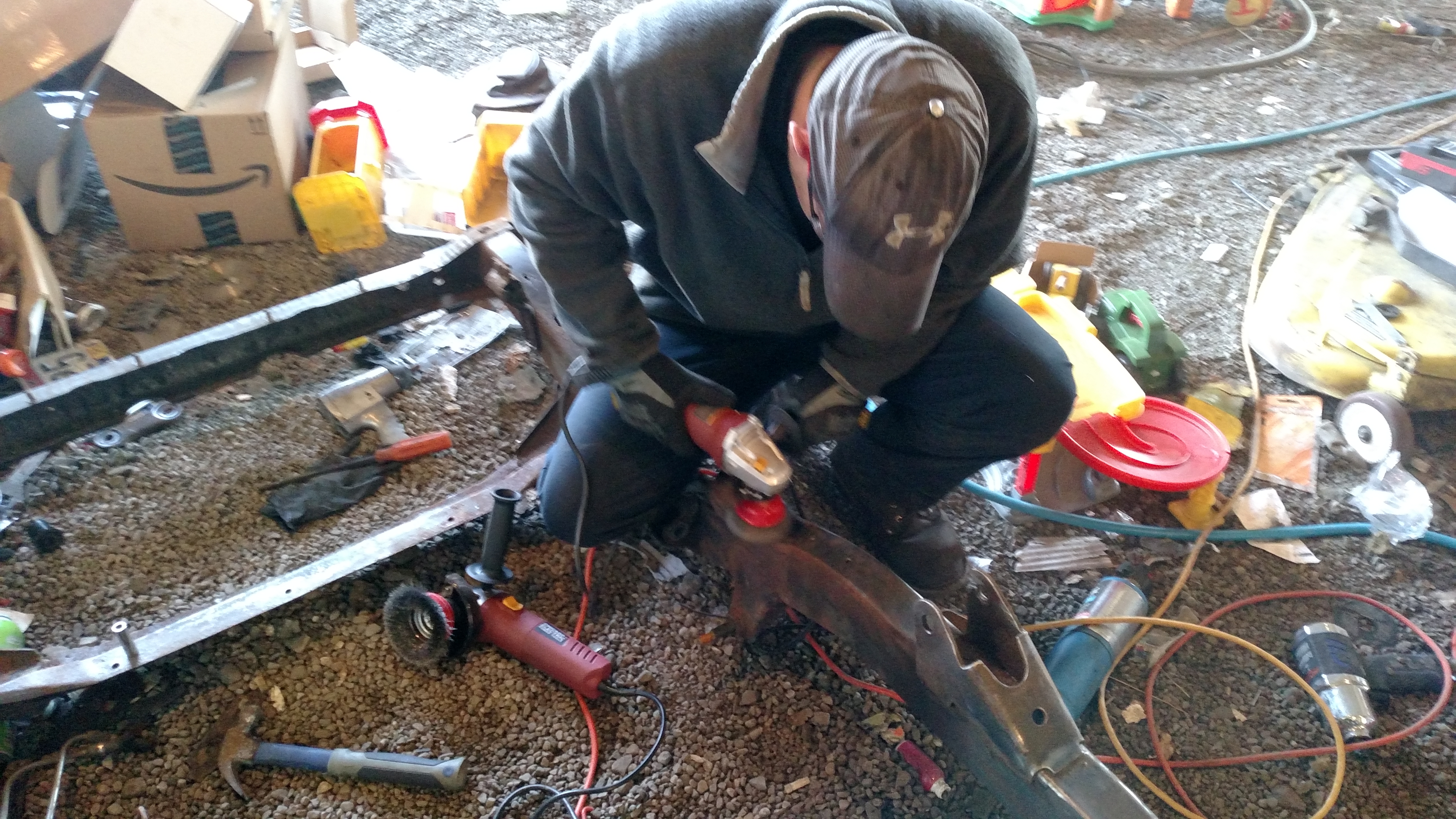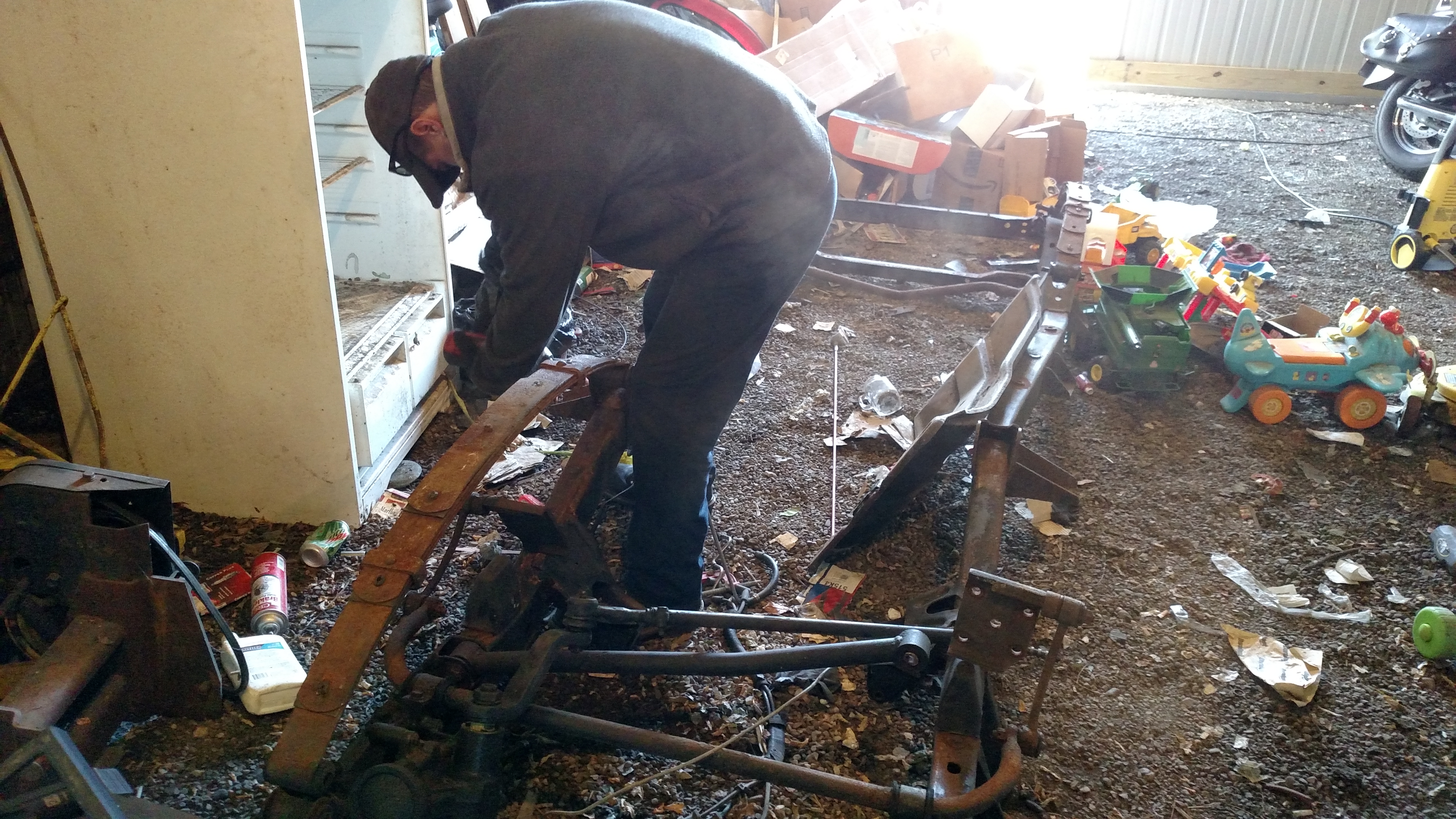 It was warm Sunday so I decided to get to work on stripping the new frame for the frame swap not too bad today I was able to get the old leaf springs off which were a royal pain in the butt had to cut the bolts off to remove them but I only had two broken bones bolts and the rest of them came off pretty easy started sending down the frame I'm really surprised at just how solid this Frame is this thing is almost shining but I think once I do the POR treatment I think this thing will rock