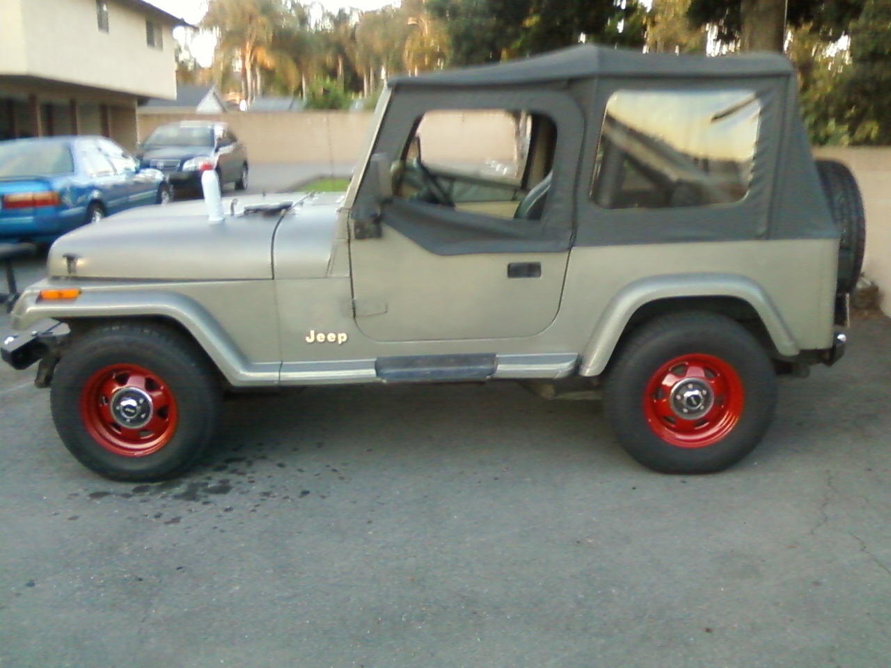 Well I decided to go ahead and paint my stock Wrangler rims until I can get a set of the new ones...It looks like a Christmas Jeep. My son came up with a clever idea for the WRANGLER side emblems. Drop the W and the L and make it RANGER...9 yr olds are so much fun. sorry about the fuzzy phone pic.
