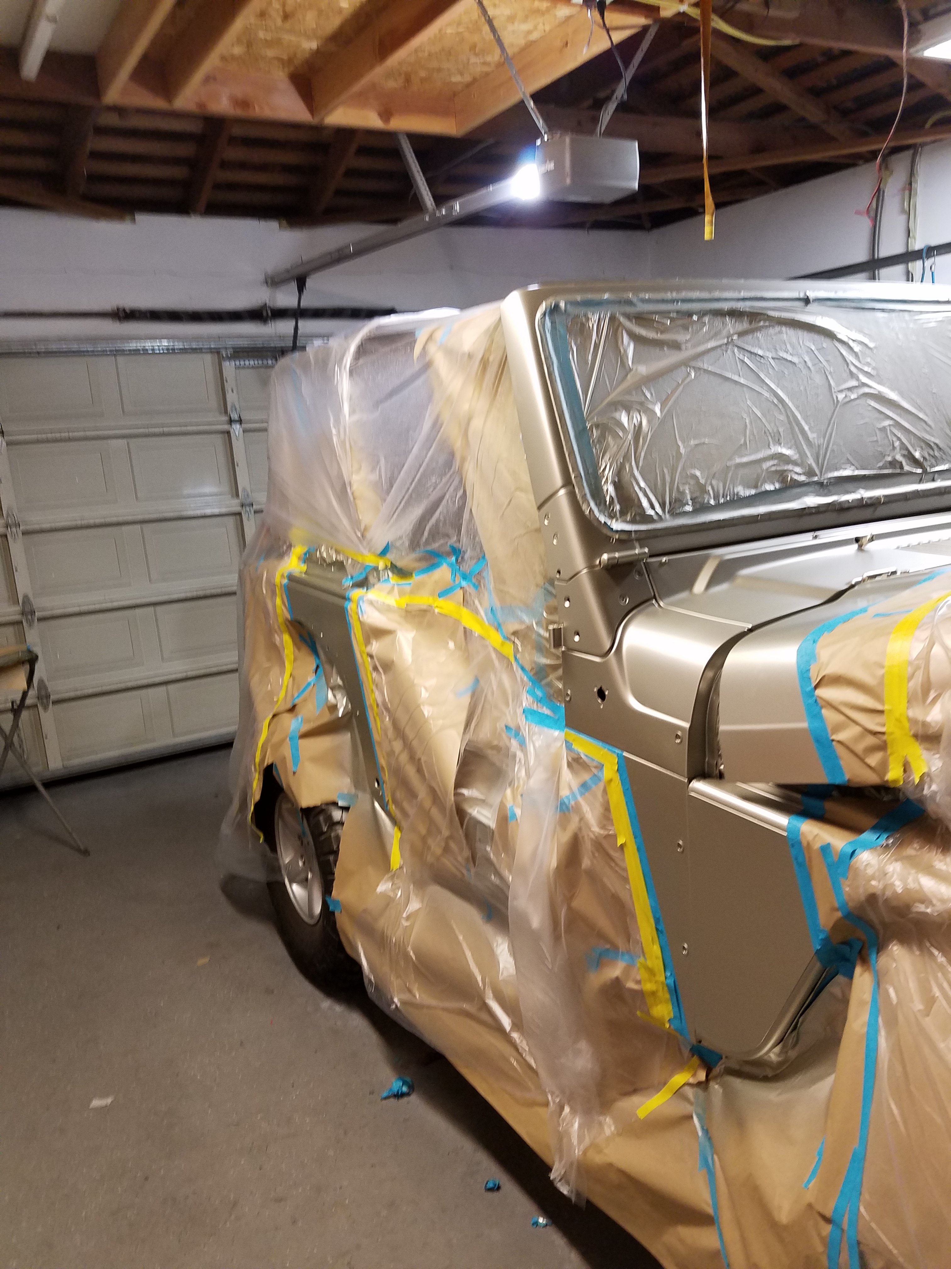 Since its original purchase, the Jeep has received many functional upgrades; 8.8 axle in the back, HP dana 30 in the front, Undercover Fab Ultra-High Clearance Skid, 4.88 gears, rear OX locker, front locker, etc., etc., but never anything cosmetic. I'd been lurking on this forum for awhile, as it's always been a dream, so I had just enough info to be dangerous. Sand Beige Metallic and Ford Performance Red were my chosen colors, and EdynB so graciously posted an image with all the line measurements/angles for a TJ in the paint section, along with vendors to purchase the logos and stencils from. I had all the info I needed, and most importantly, a best buddy who happens to be a manager at an auto body shop. You've read enough text. Feast your eyes: