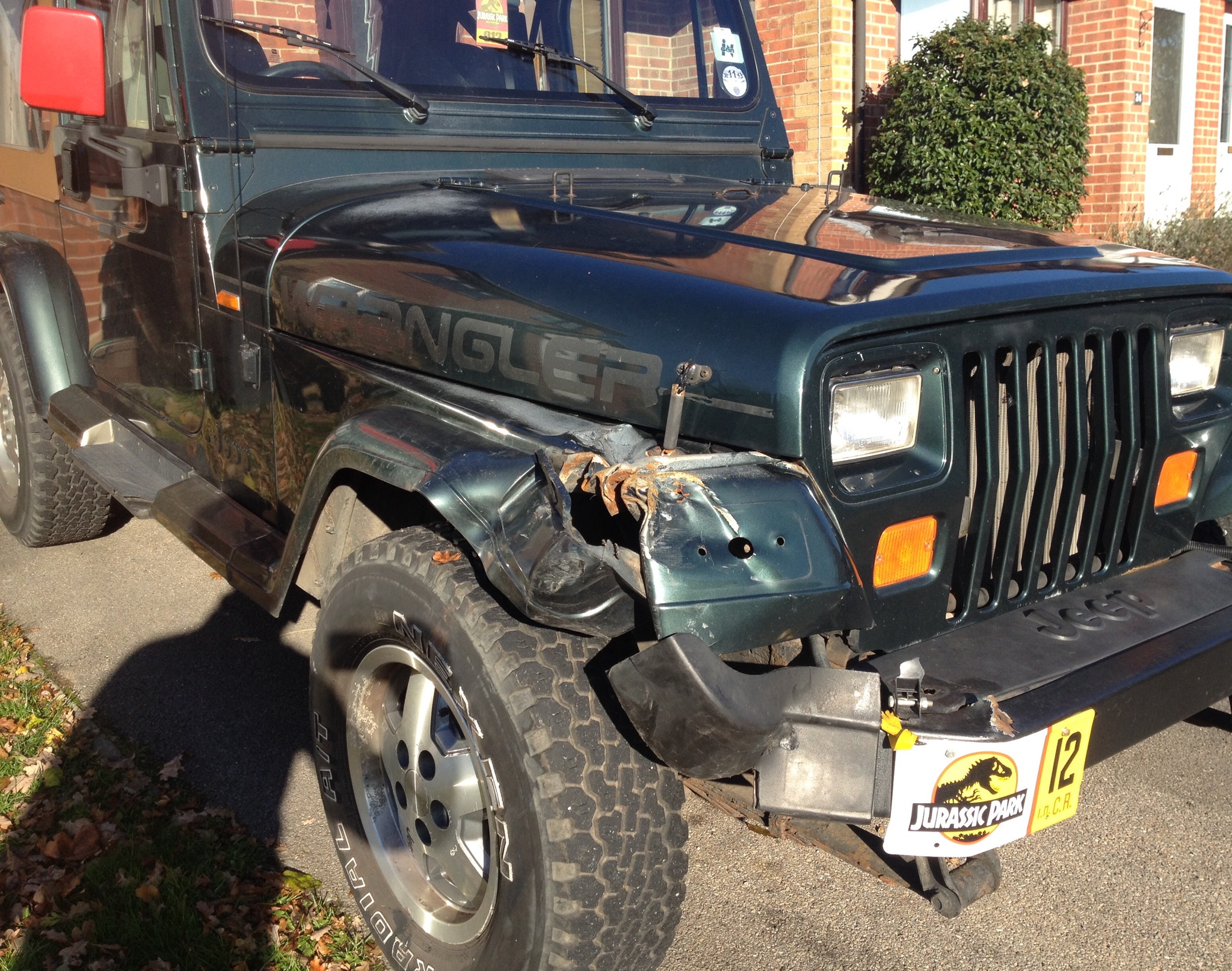 he cut the corner causing me to hit him. so the damage to mine is bent front bumper & front wing/flare, broken spot & hood latches!!! GRRRR so annoyed! he is denying it so its down to insurance arguing. its going in for repairs on monday so no jeep for a week. but he is going to paint the new wing in the sand biege so i can see what it will look like, bit by bit i guess ha!! (hopefully all update pics are loading still got a crap laptop)