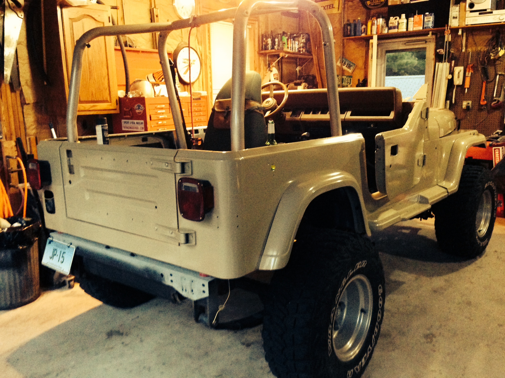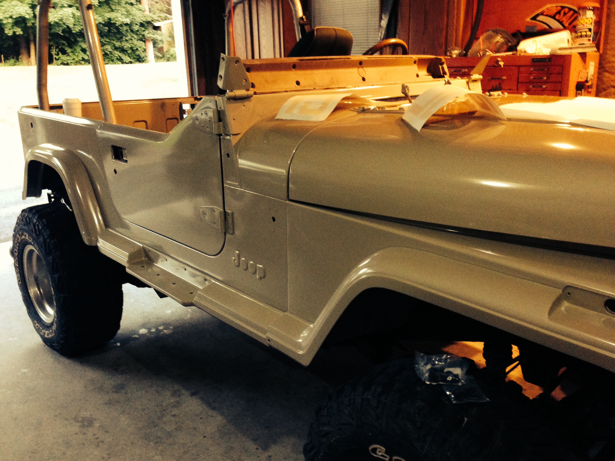 The tan has been sprayed! Father in law sprayed the doors, windshield, and tailgate while I was there. While he was working on that, I gave the rest of the Jeep a final sanding and masked everything off.