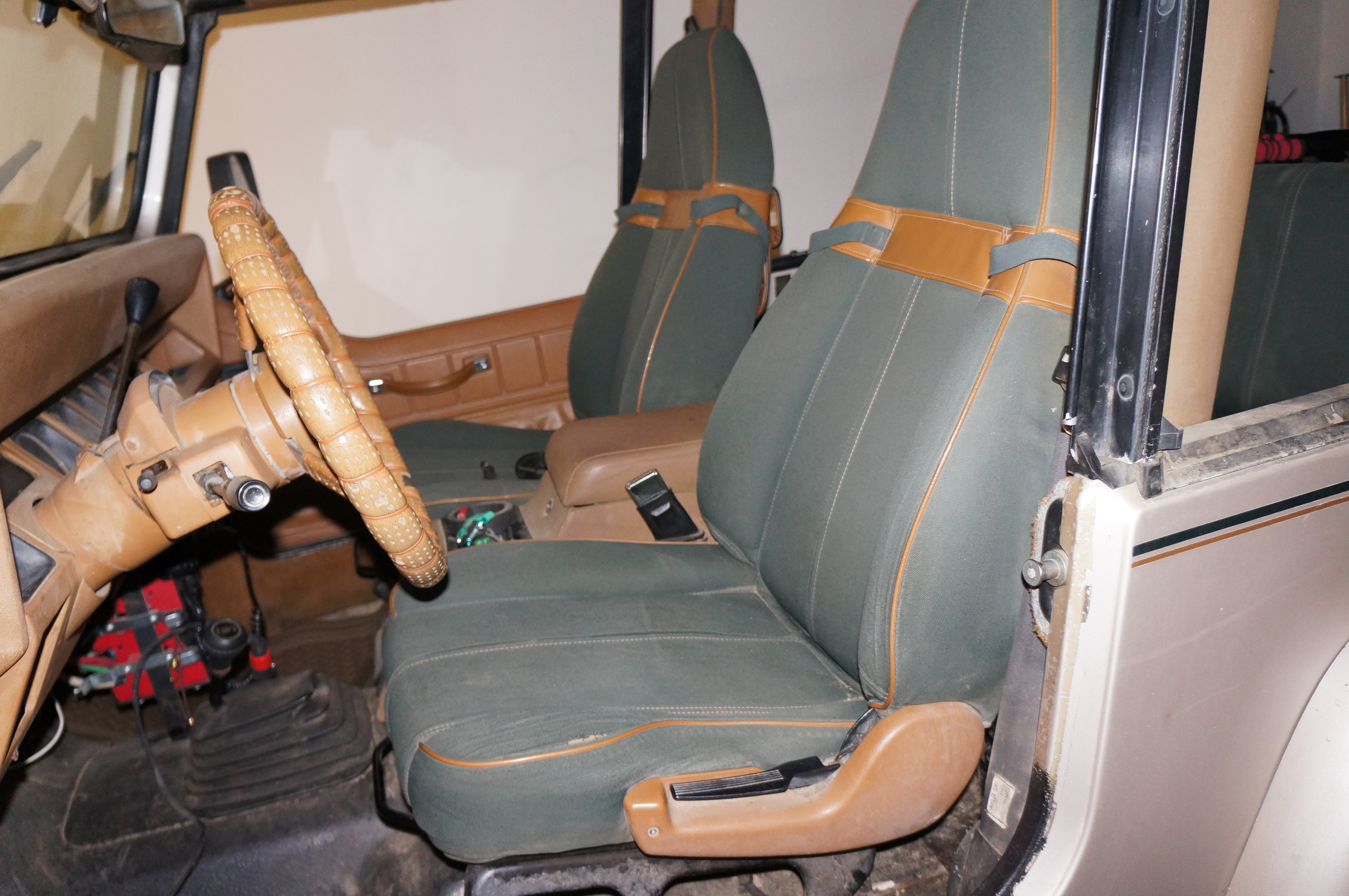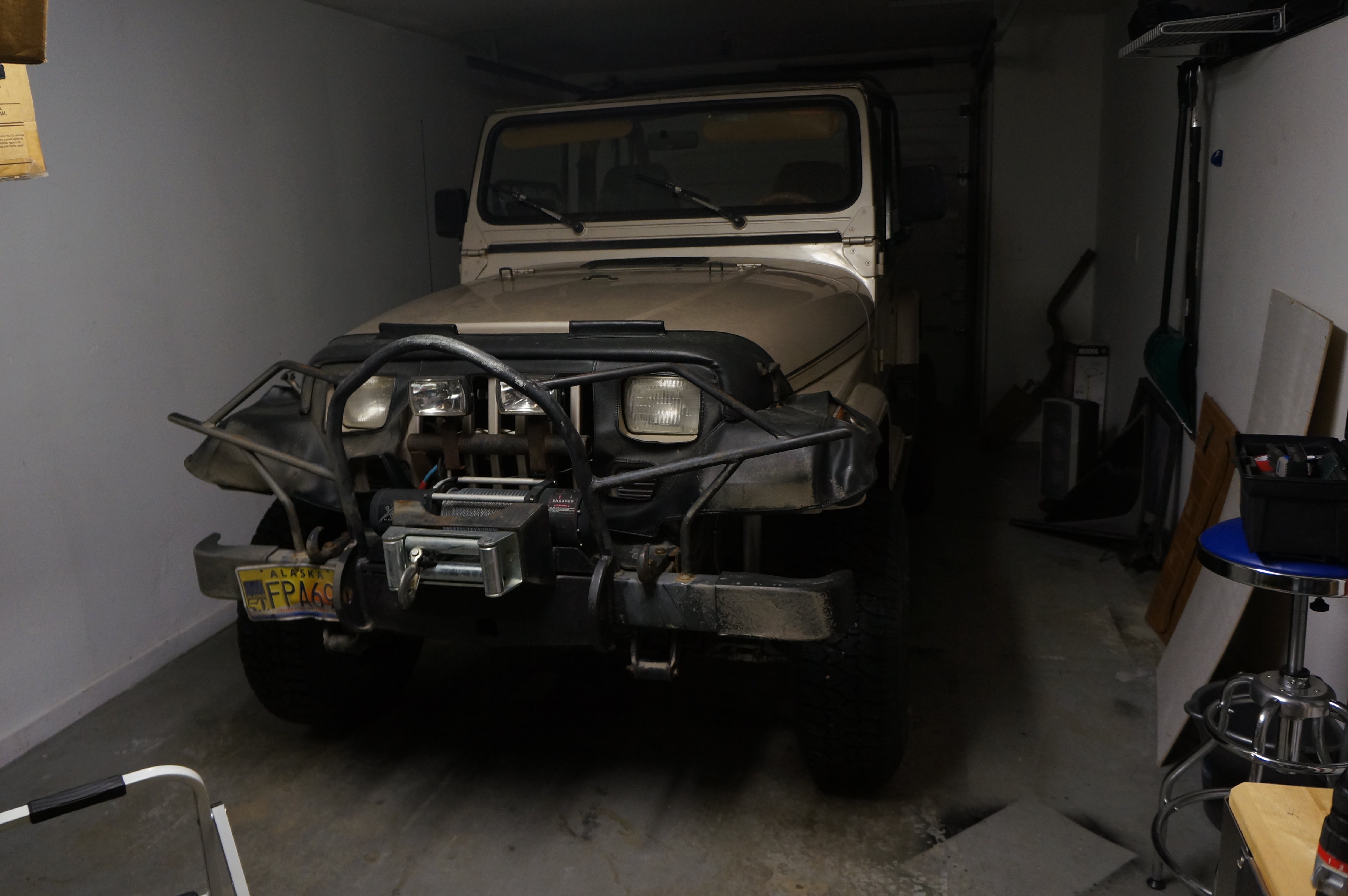Hey everyone, from my introduction everyone probably knows that up here in Alaska, one does not get many opportunities to find a YJ...a Sahara YJ none the less. Well just yesterday one was posted to craigslist down in Kenai. Im in Fairbanks so that about an 8 hour drive or a $300 flight. But its a 95 Sahara with the green trail cloth seats and the sandy beige body color. It is an automatic and I want to make a #12 so it would be more screen accurate than a manual. its also the first year with the galvanized chassis so thats a big plus, even though Alaska doesn't use salt on the roads, we use gravel (so instead of you car rusting, you tend to lose a windshield every other year, but thats better than rusting in my opinion). Only things I foresee as potential problems, from the picture, is that its suspension has been modified as well as the bumpers. Here is the kicker though...only 79,000 miles!!! verified by autocheck and carfax so hopefully thats accurate. Posted a Pic to see what everyone thought and more are coming tomorrow, the guy is going to email them to me. I know its my jeep and its what I will make of it, but please feel free to throw comments out there. The price is $7,000...a bit high, but if the miles are really that low Im game....plus it might be years till I see another one of these. Ive been searching for almost a year and a half and have only ever found 2 saharas that still had the green seats...this one and one that someone didn't want to sell. Alot of that $7,000 is due to the upgrades that I unfortunately will not be using