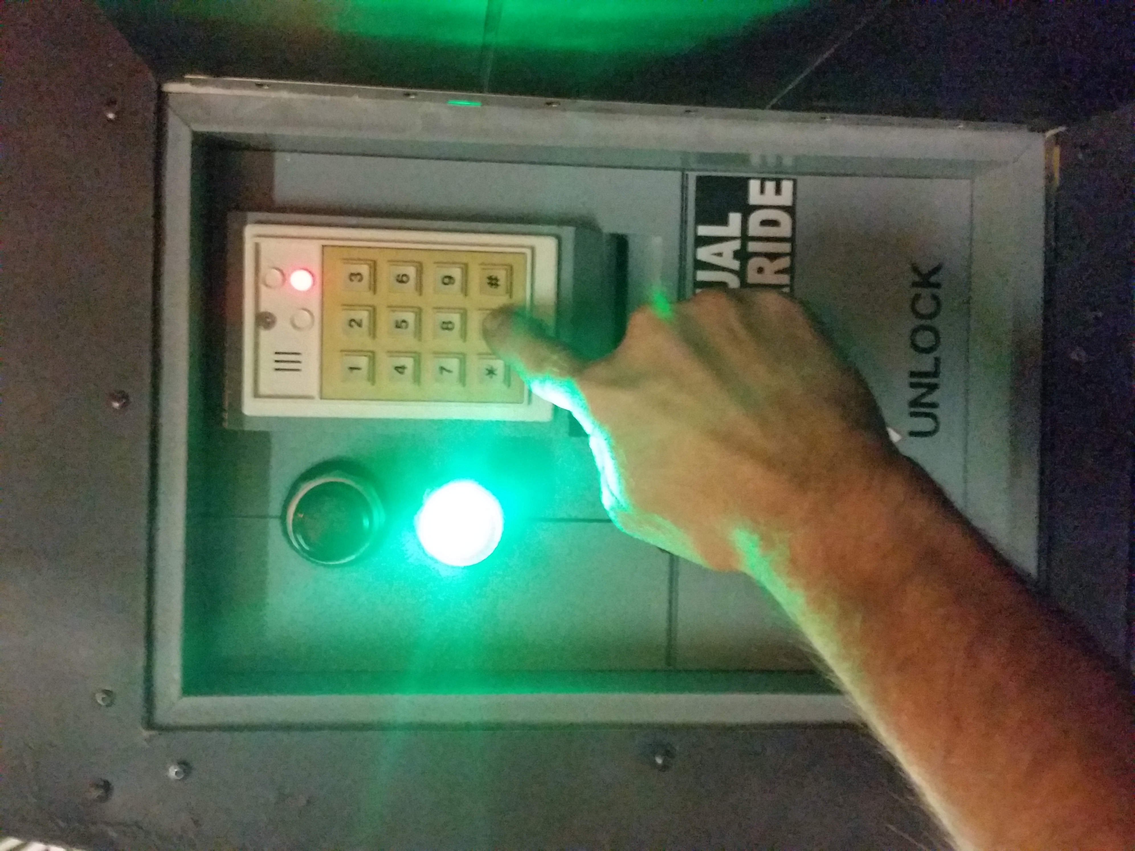 In this scene Dennis has driven up to the gate, exits the jeep, opens the panel access door, turns the override handle allowing him to manually push the gates open