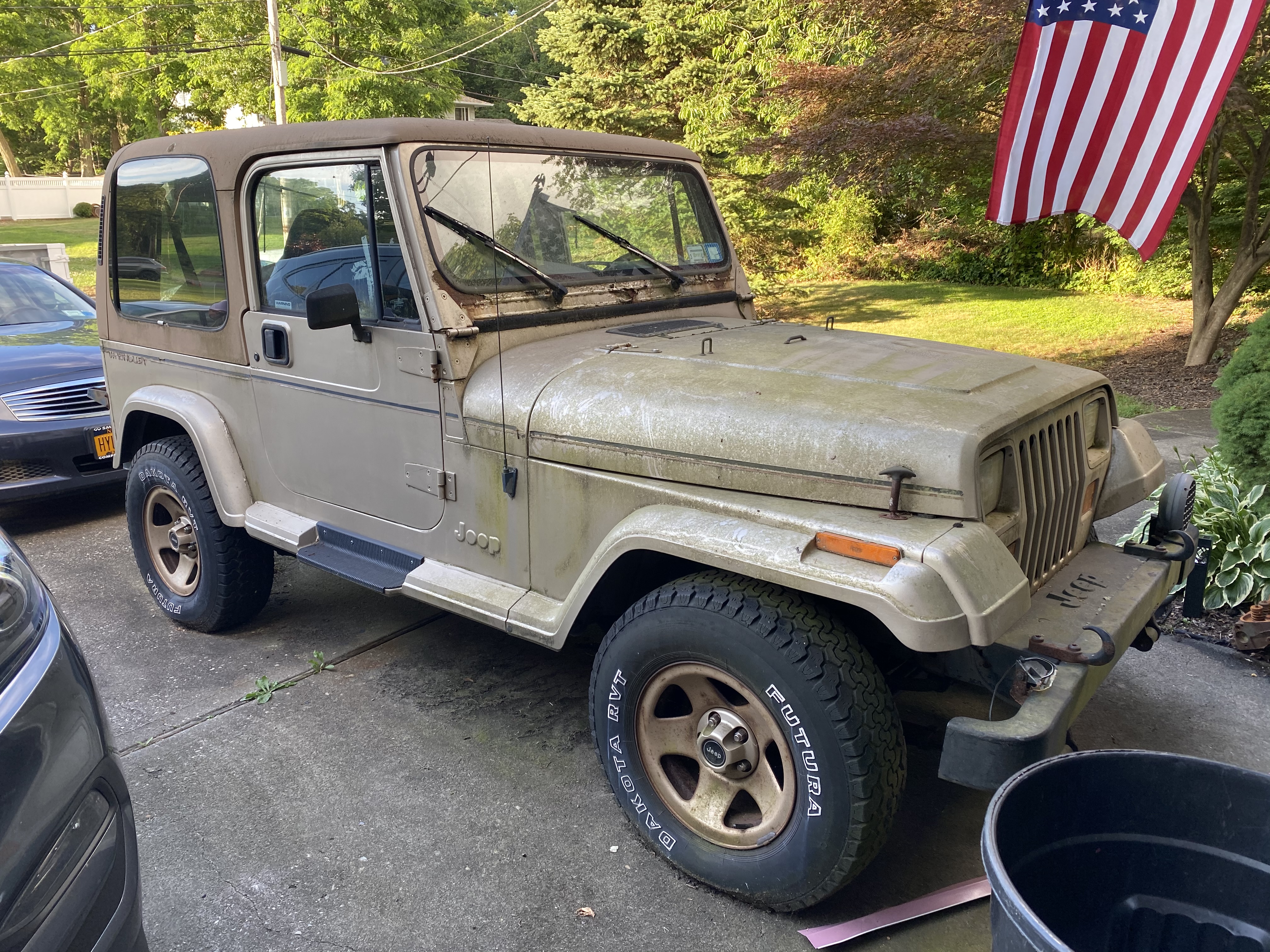 Here we go, I bought her today for a song as a summer project. 1993 Sahara Champagne. Needs a resto and possibly a motor, hasn’t run in 5 years but minimal rust for being a NY Jeep all its life.