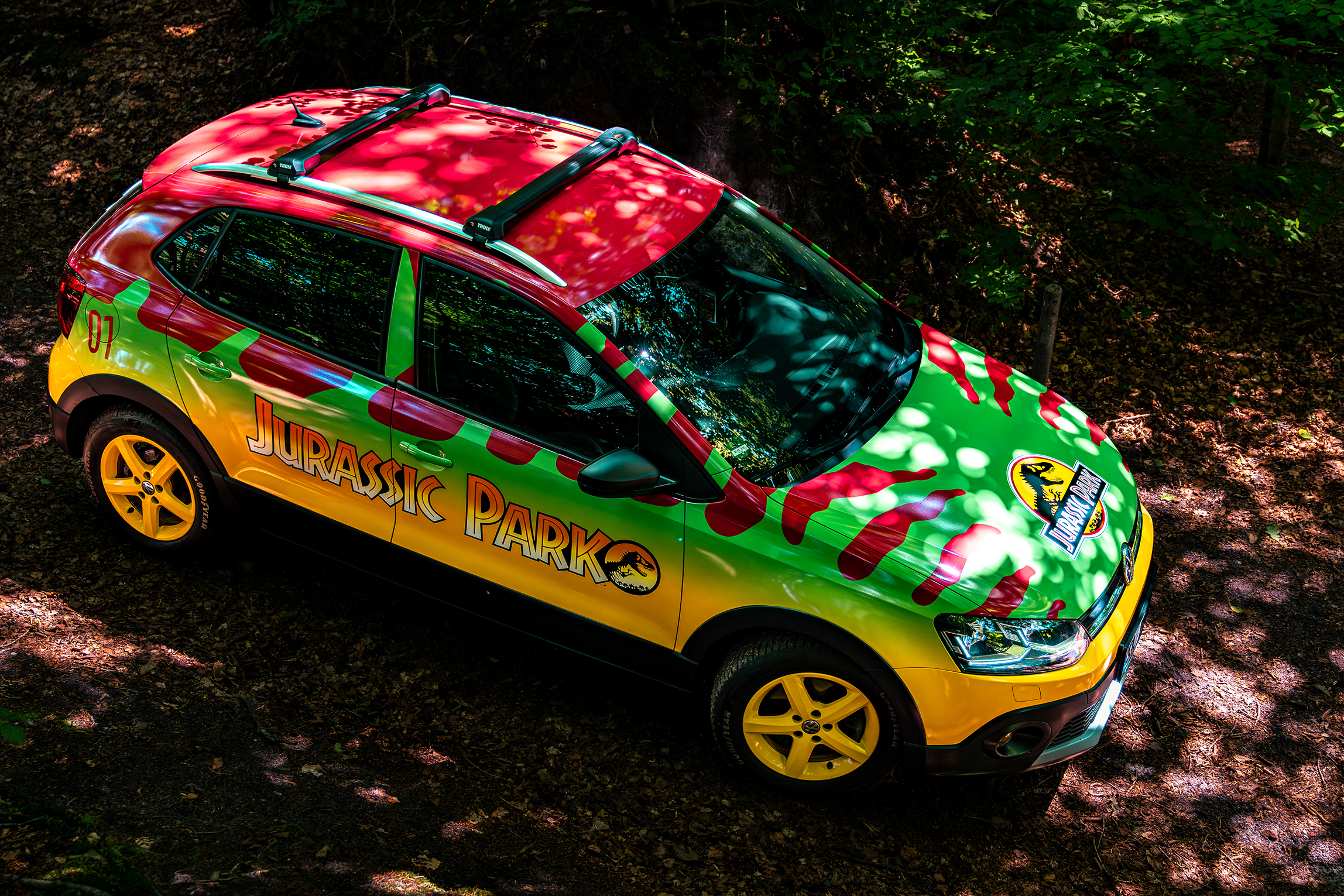 Hi my name is Yari and I am currently designing JP01. In Germany, our Jurassic Park is a bit smaller, so we drive the 2016 Volkswagen Polo here. Gasoline is not cheap either, so I chose the 1.0 TSI (110HP). The mirror tag is up and the wrapping is finished. The 17-inch rims will soon be replaced with 15-inch rims, which still have to go to the painter. The mirror caps will also be black and possibly the B-pillar too.