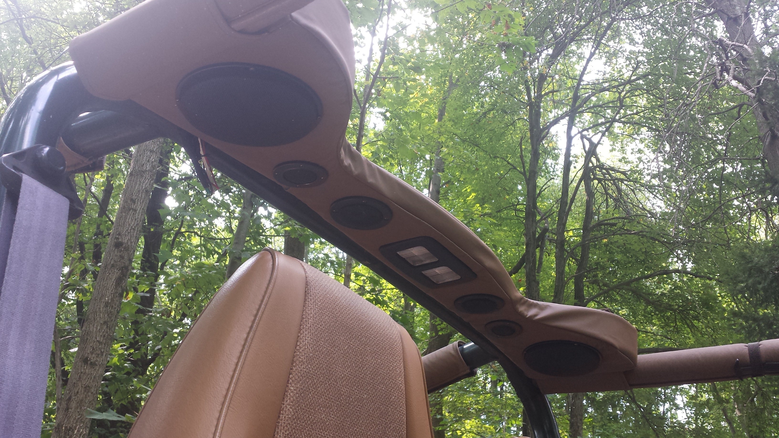 Here they are all installed! Sounds super clear and loud at highway speeds. I actually ran the speaker bar wires through the roll cage bars. I really didn't like the idea of them being exposed. Thought it would be ugly looking. Where I placed the amp I really thought it was the best place I could place it. I didn't want it under the back seat in case i took it out to load something in the trunk and it just wouldn't fit anywhere else. So now i have the dilemma of how to fasten it down, out of the rain and so i wont be stolen. I'm thinking of making a box around/over it. Any thoughts?