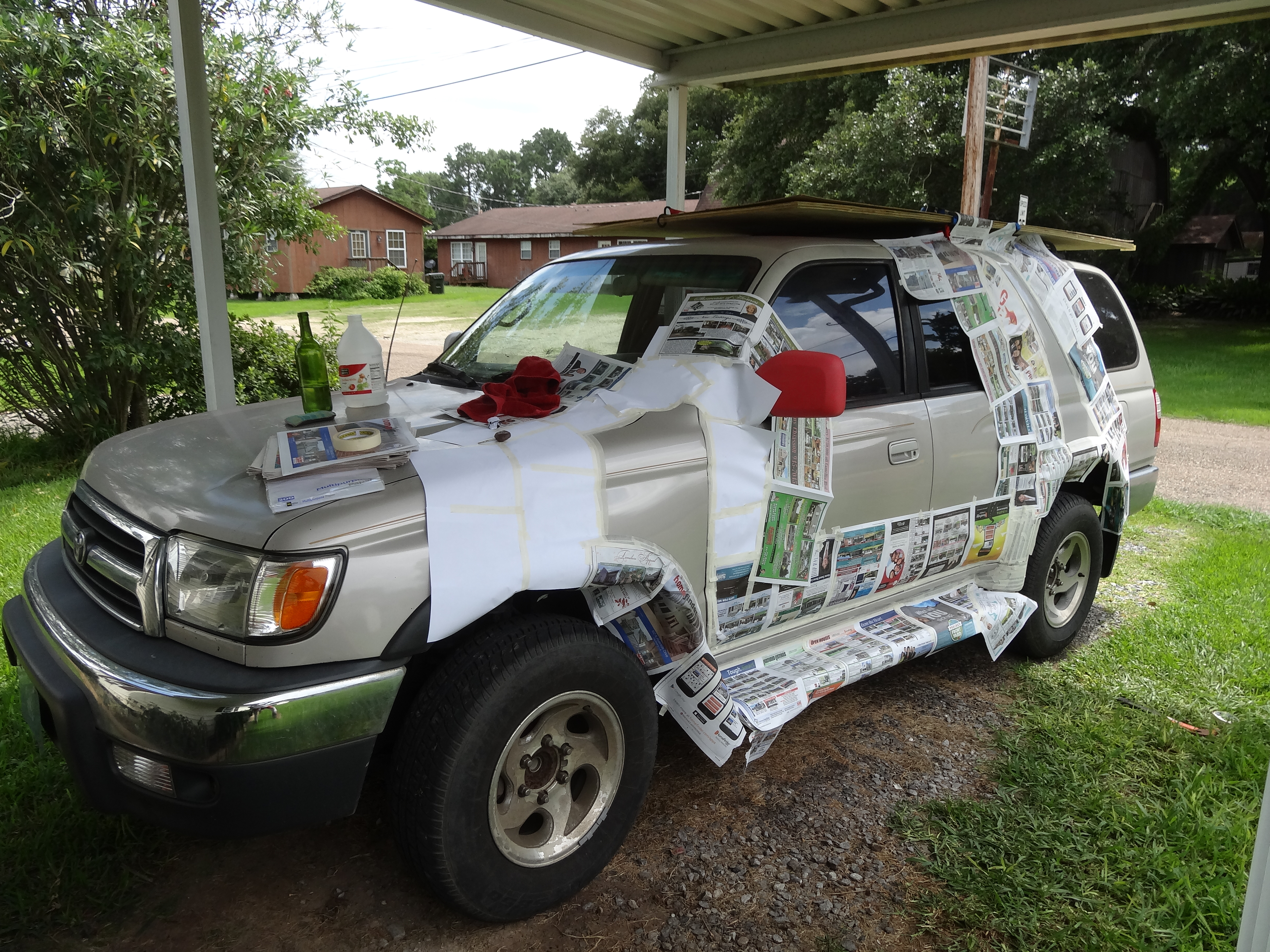 Okay, getting to work on one side of the vehicle. Seeing as how it took about 2 hours of hard work in the Louisiana heat to get it taped up I'm going to be done for today. I'll tackle the other side next week and probably the wheels.