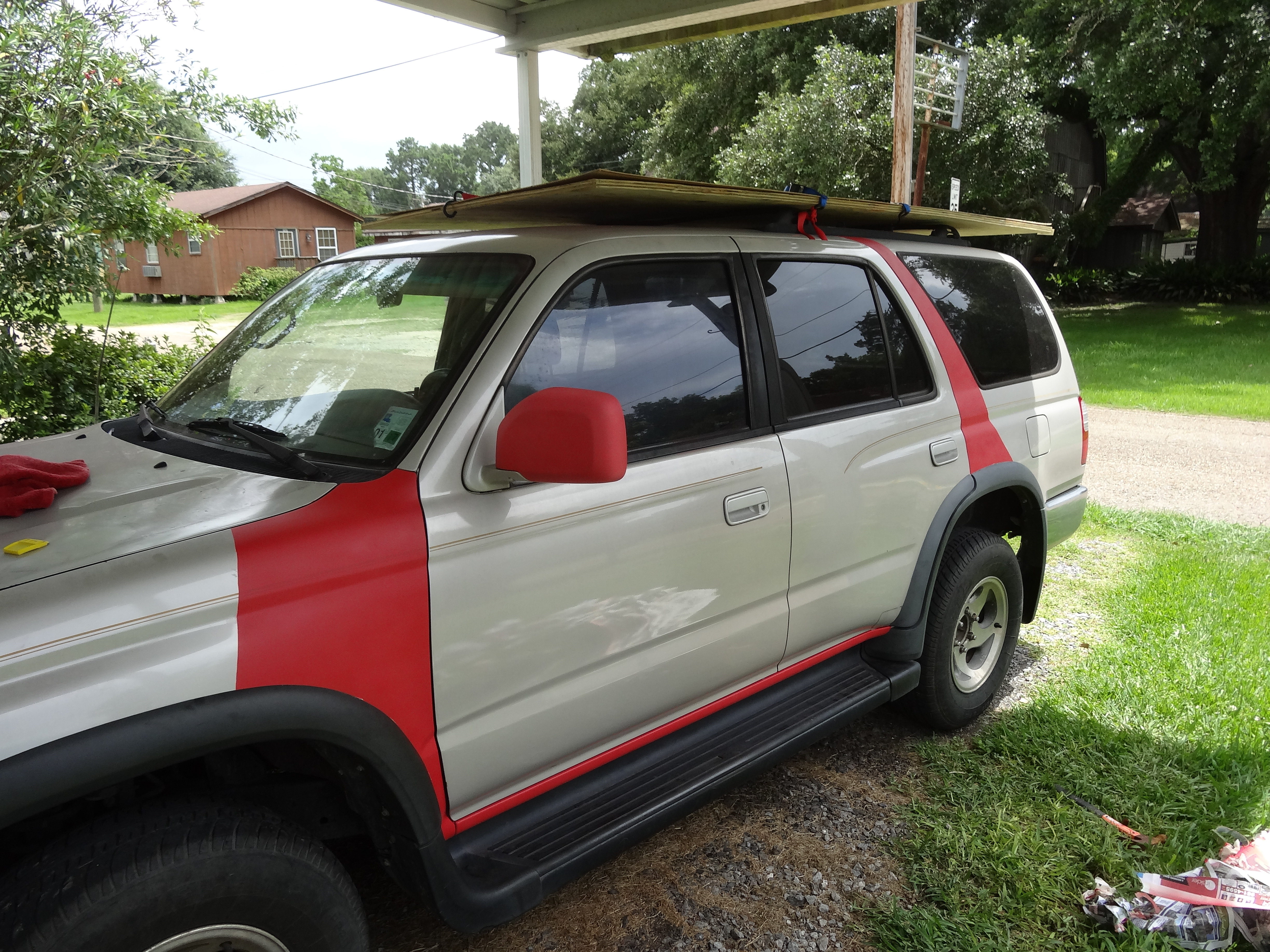 finished the side. had a couple of edges want to peel...had to end up using a razor blade and scoring the crap out of the paint underneath but oh well, I guess I have no choice now but to keep it a JP 4Runner. Even if the Flexi-dip comes off I'll just have to redo it with regular red car paint.